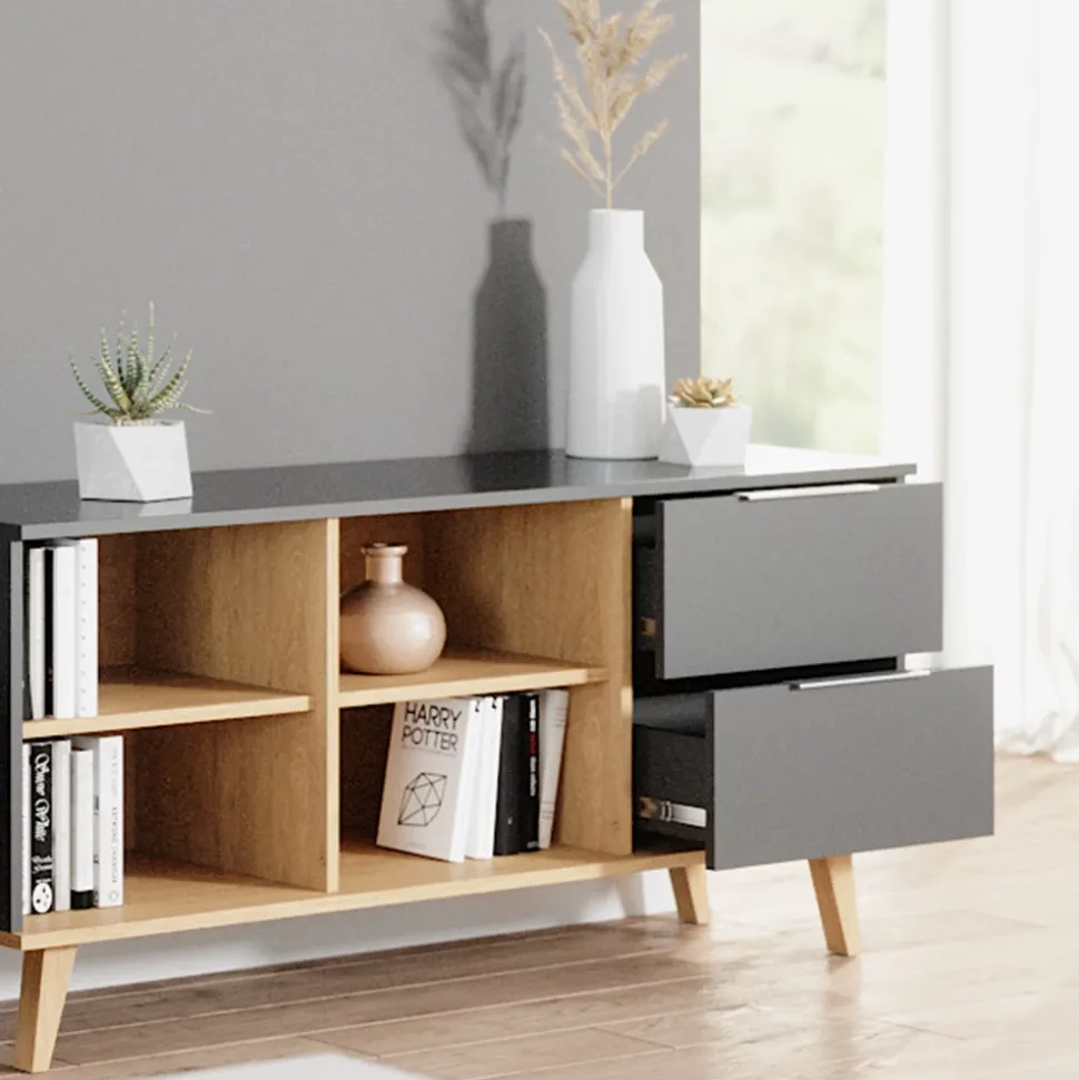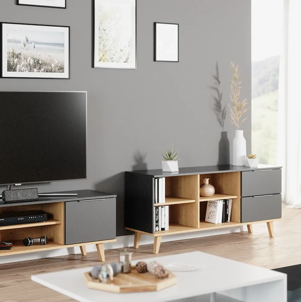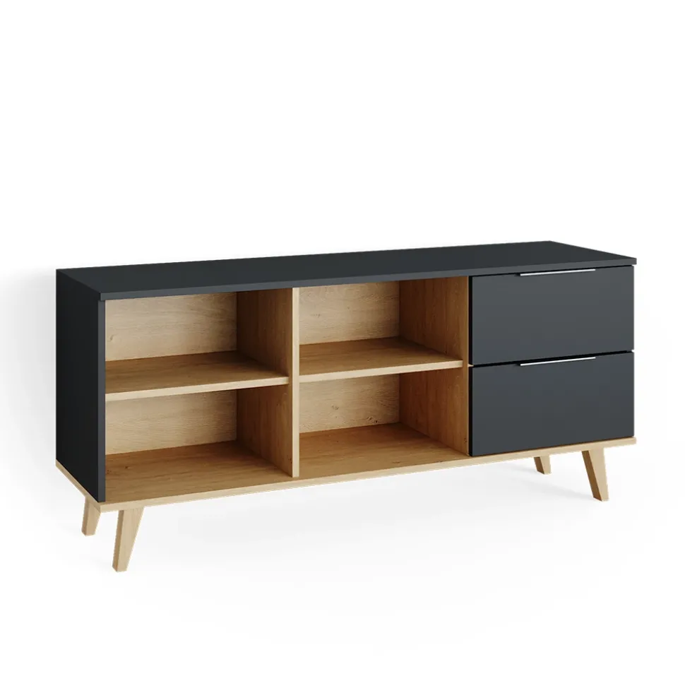 - Der Fernsehtisch Neptun bietet mit 2 Schubladen und offenen Regalen ausreichend Stauraum für TV-Zubehör und verfügt über elegante Füße für einen stilvollen Look.