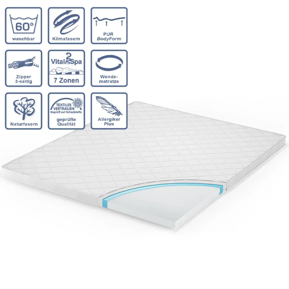 - Die Matratzen-Auflage dient als zusätzlicher Schutz für die Matratze und sorgt für einen erhöhten Liegekomfort. Sie ist einfach aufzulegen und kann leicht gewaschen werden.