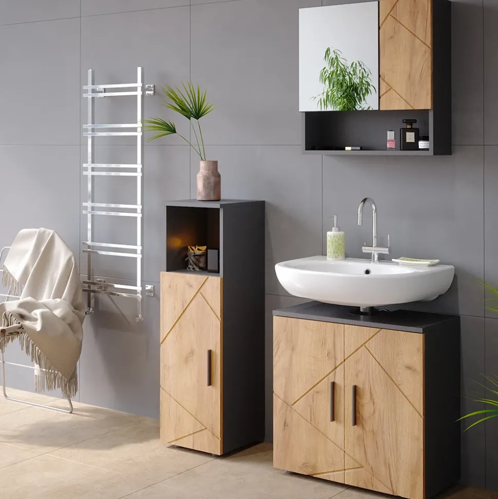 - MATERIAL: Der Badschrank besteht aus pflegeleichter Spanplatte 16 mm, mit einer Melaminharzbeschichtung. Einige Bestandteile des Artikels sind aus MDF gefertigt