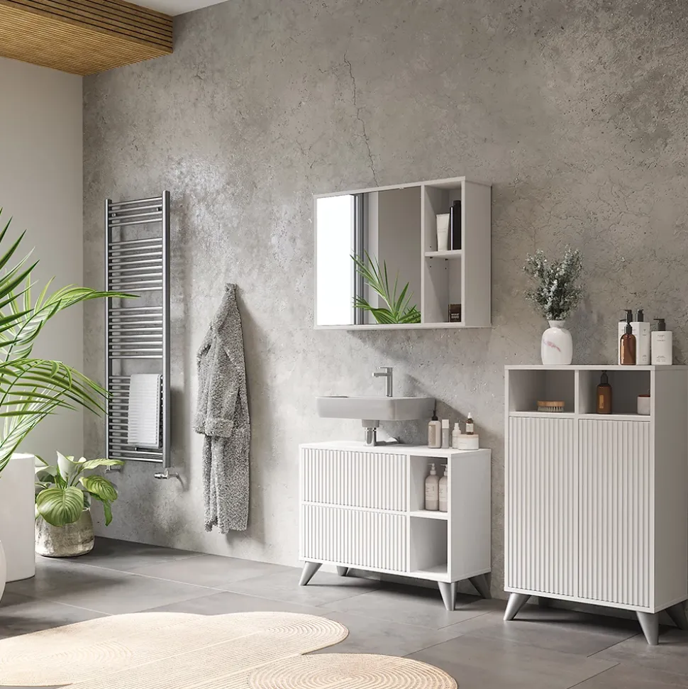 - Die Badmöbel überzeugen mit modernem Design und bieten ausreichend Stauraum, ideal für kleine Badezimmer.