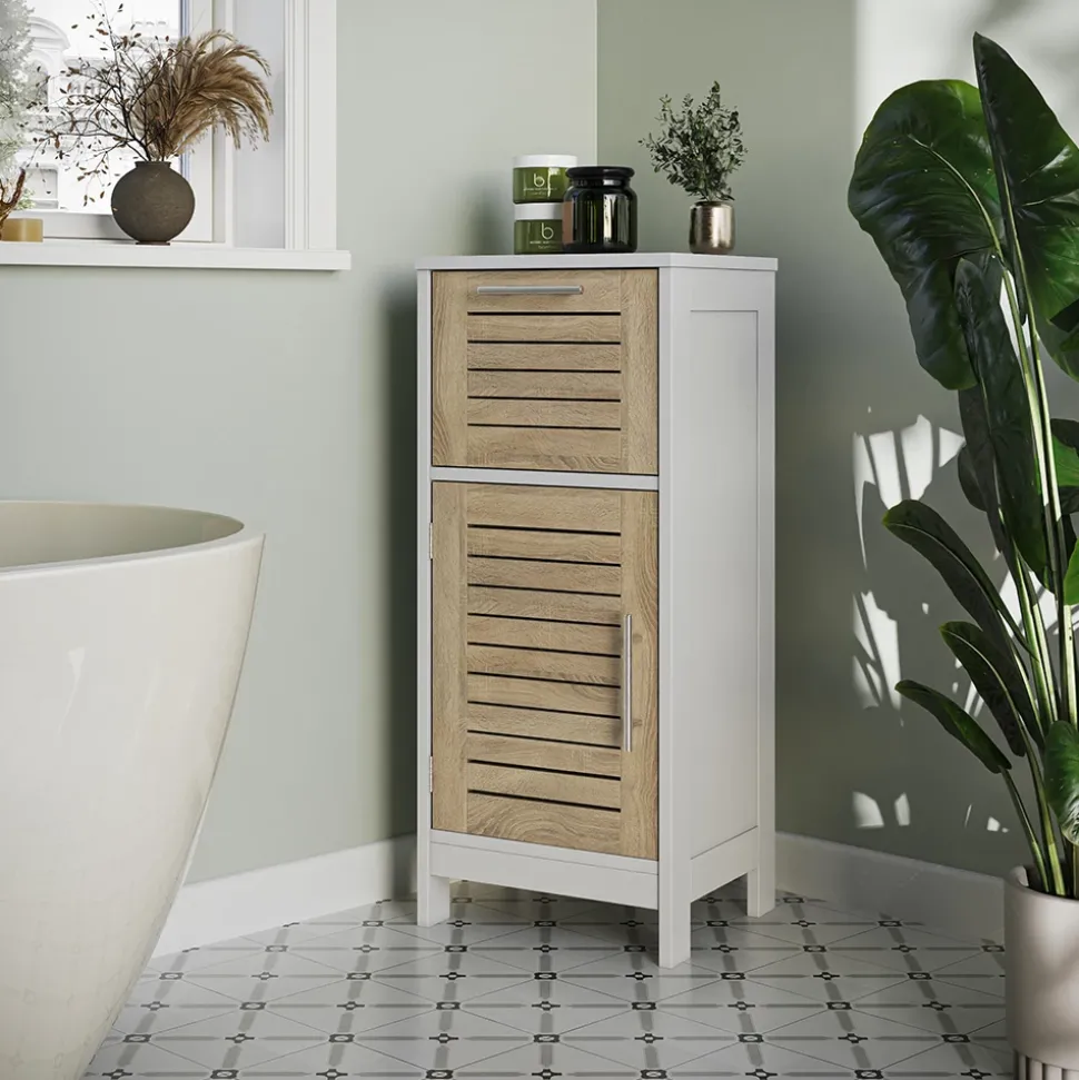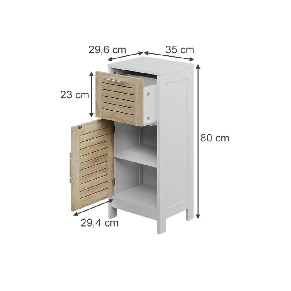 Entdecken Sie den Midischrank Looma – eine stilvolle Lösung für Ihr Badezimmer, die Funktionalität und Design perfekt vereint. Dank seines durchdachten Lamellen-Designs ermöglicht dieser Schrank eine optimale Luftzirkulation, während robuster Metallgriffe den täglichen Gebrauch erleichtern. Der Looma bietet Ihnen viel Stauraum auf engem Raum – mit einer praktischen Schublade und einem geschlossenen Fach mit Einlegeboden, um all Ihre Badutensilien ordentlich zu verstauen. Stellen Sie sich vor, wie Sie morgens entspannt in den Tag starten, während alles, was Sie brauchen, griffbereit und stilvoll organisiert ist. Lassen Sie sich von der Kombination aus durchdachter Funktionalität und modernem Design inspirieren.