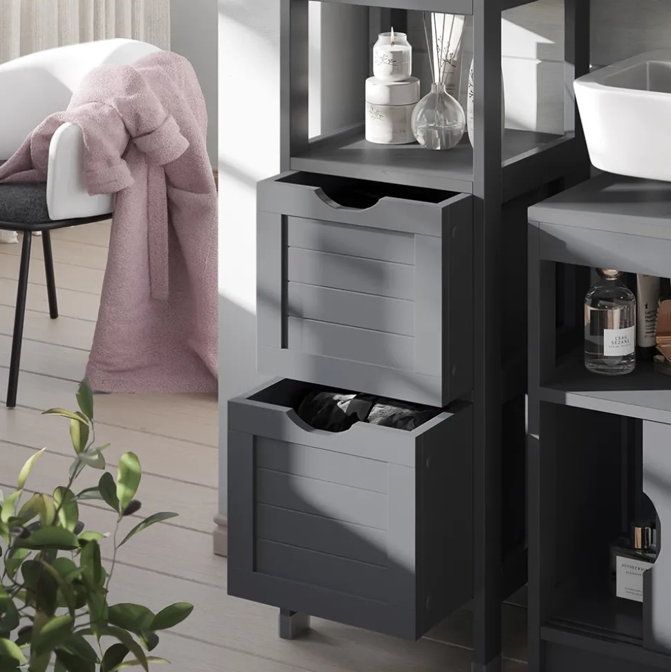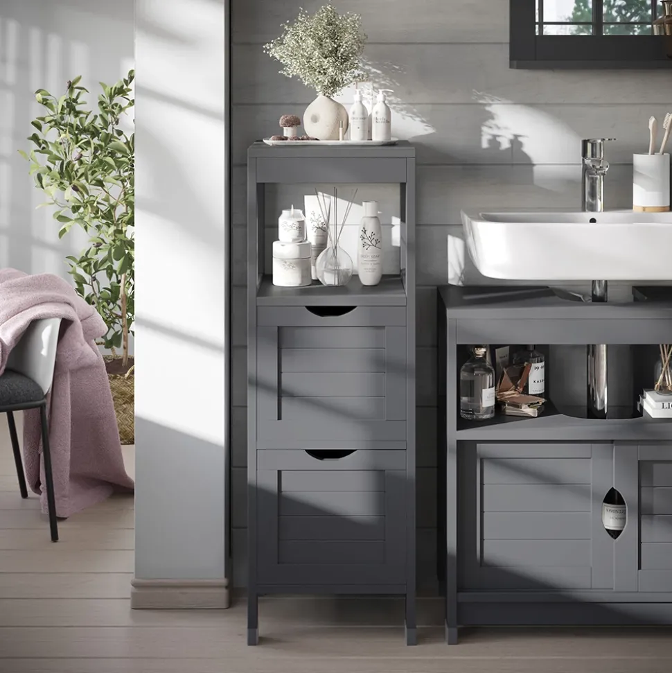 Der Midischrank Vilda ist die perfekte Ergänzung für jedes Badezimmer. Mit seinen offenen Ablagefächern bietet er Platz für oft benötigte Utensilien, während die zwei großen Schubkästen zusätzlichen Stauraum bieten. Die stabile und pflegeleichte Konstruktion sorgt dafür, dass dieses Möbelstück lange Zeit in Ihrem Badezimmer bleibt. Das kompakte Design passt in jede Ecke und fügt sich nahtlos in jedes Bad ein. Holen Sie sich den Midischrank Vilda und genießen Sie eine organisierte und aufgeräumte Atmosphäre in Ihrem Badezimmer.