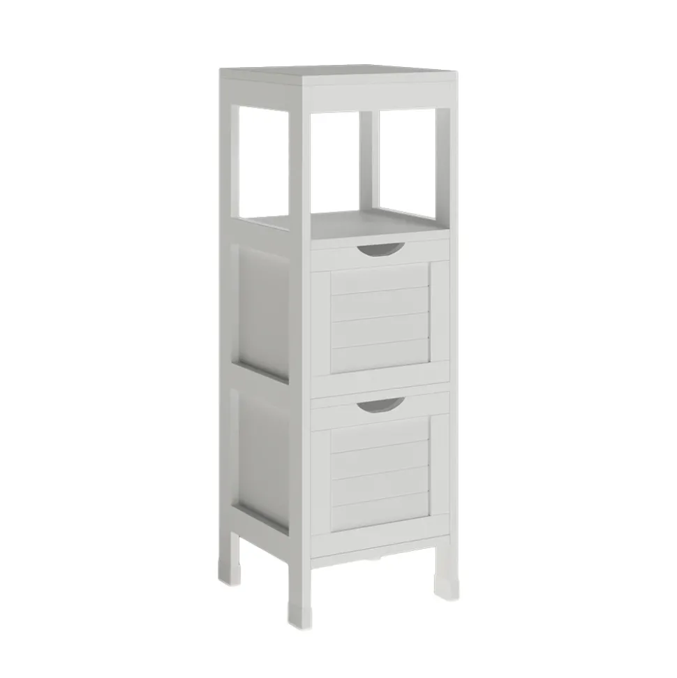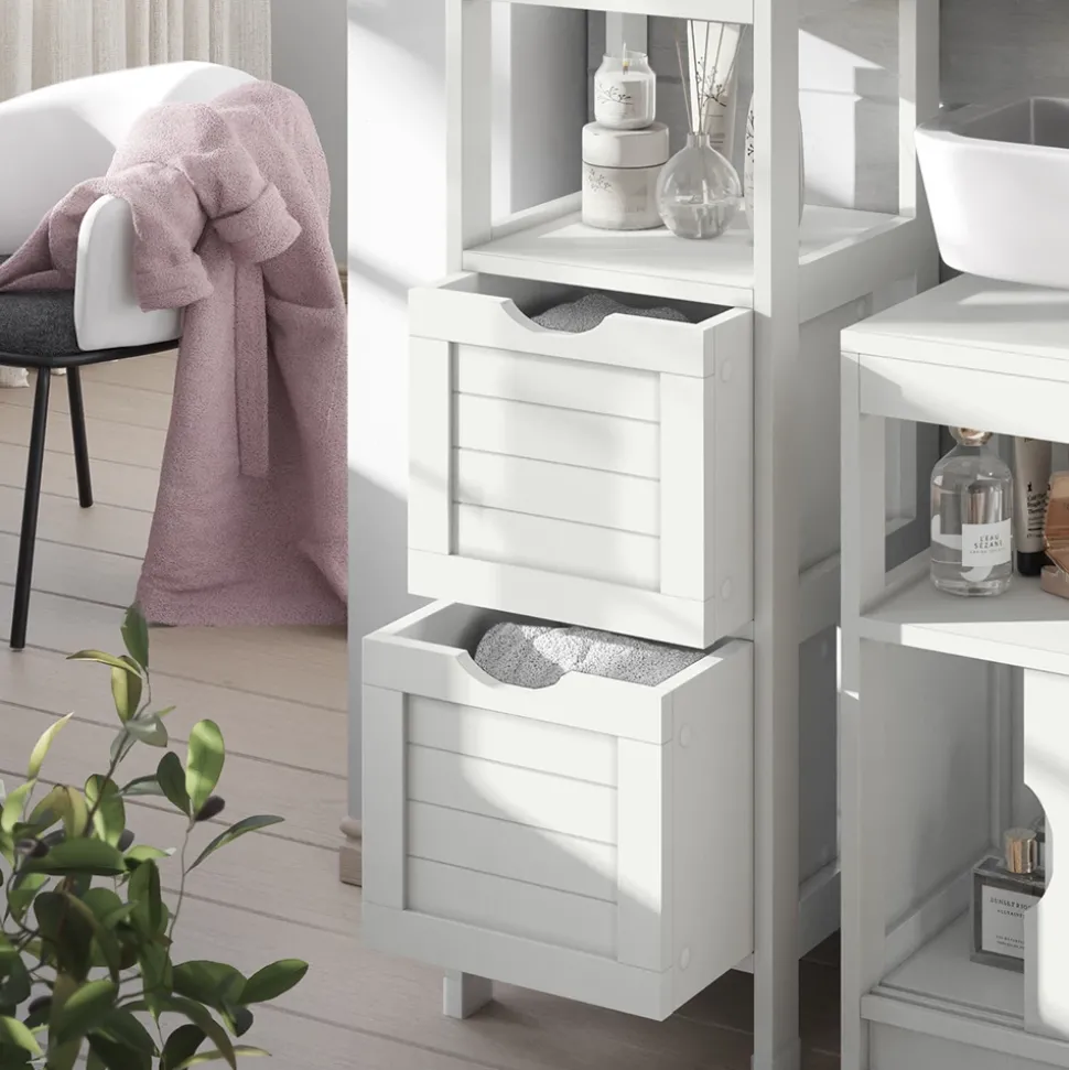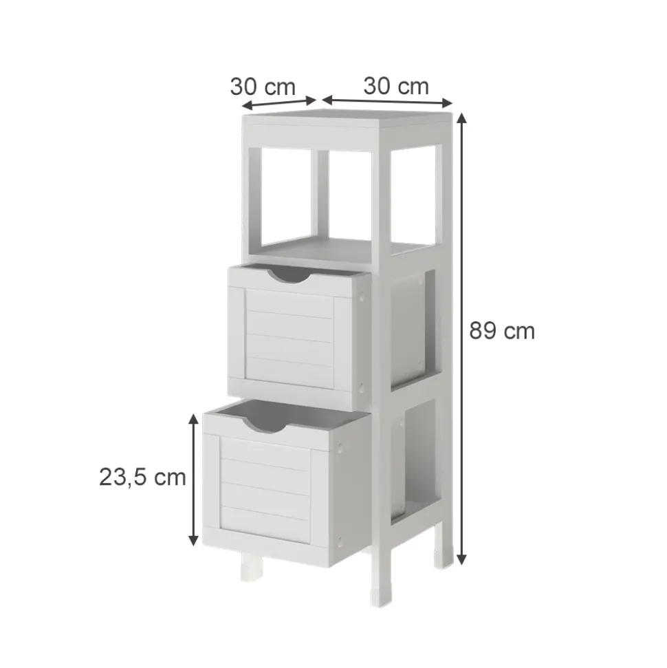Der Midischrank Vilda ist die perfekte Ergänzung für jedes Badezimmer. Mit seinen offenen Ablagefächern bietet er Platz für oft benötigte Utensilien, während die zwei großen Schubkästen zusätzlichen Stauraum bieten. Die stabile und pflegeleichte Konstruktion sorgt dafür, dass dieses Möbelstück lange Zeit in Ihrem Badezimmer bleibt. Das kompakte Design passt in jede Ecke und fügt sich nahtlos in jedes Bad ein. Holen Sie sich den Midischrank Vilda und genießen Sie eine organisierte und aufgeräumte Atmosphäre in Ihrem Badezimmer.