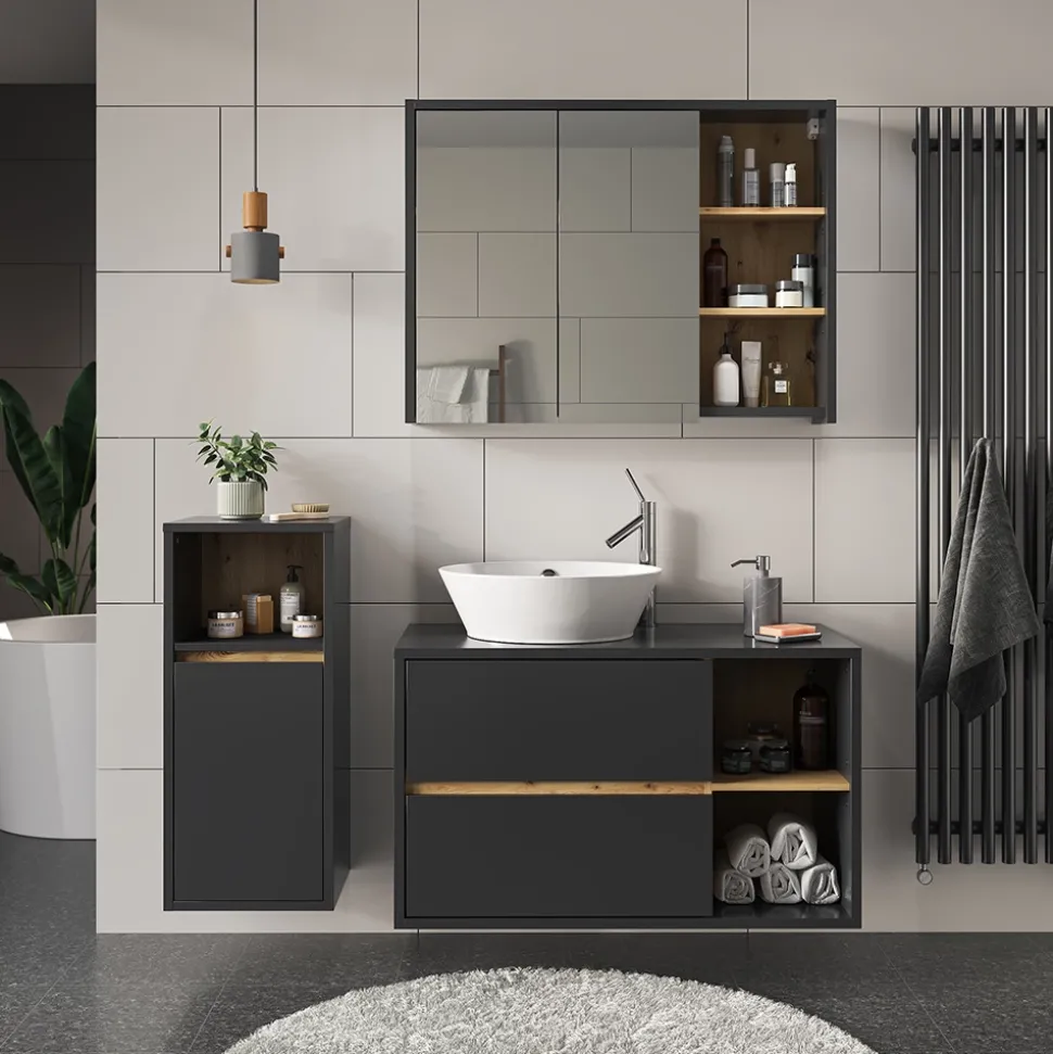 - Das Badmöbel bietet dank offenen und geschlossenen Ablageflächen, sowie reichlich Stauraum aufgehängt an der Wand eine praktische Lösung für jedes Bad.