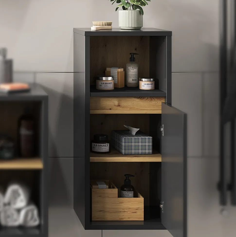 Die Kollektion Viola beinhaltet alles, was das Herz begehrt, um ein stilvolles Badezimmer zu gestalten. Der Midischrank ist dabei eine wahre Bereicherung. Mit offenen und geschlossenen Ablageflächen bietet er reichlich Stauraum für alle Dinge, die im Badezimmer benötigt werden. Das elegante Design fügt sich harmonisch in jede Umgebung ein und kann sogar an der Wand befestigt werden. Doch das Beste daran: Der Midischrank ist kompatibel mit anderen Artikeln der Viola-Kollektion. So wird aus einem einzelnen Möbelstück ein harmonisches Gesamtkonzept. Der Badschrank ist mehr als nur ein nützliches Möbelstück – er ist Ausdruck von Geschmack und Stil. Gönnen Sie sich diese kleine Luxusausgabe und verwandeln Sie Ihr Badezimmer in eine Oase der Entspannung und Ruhe.