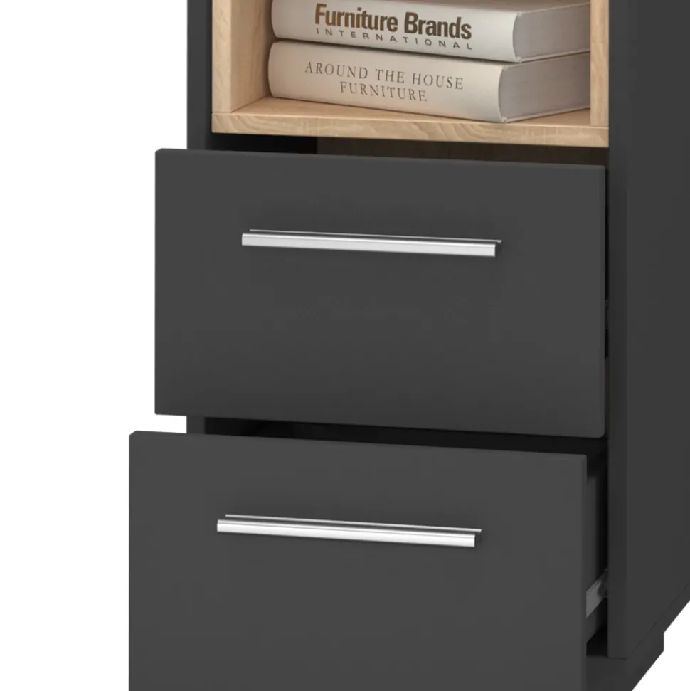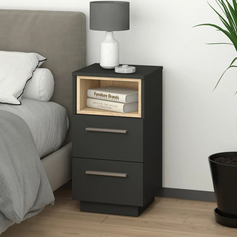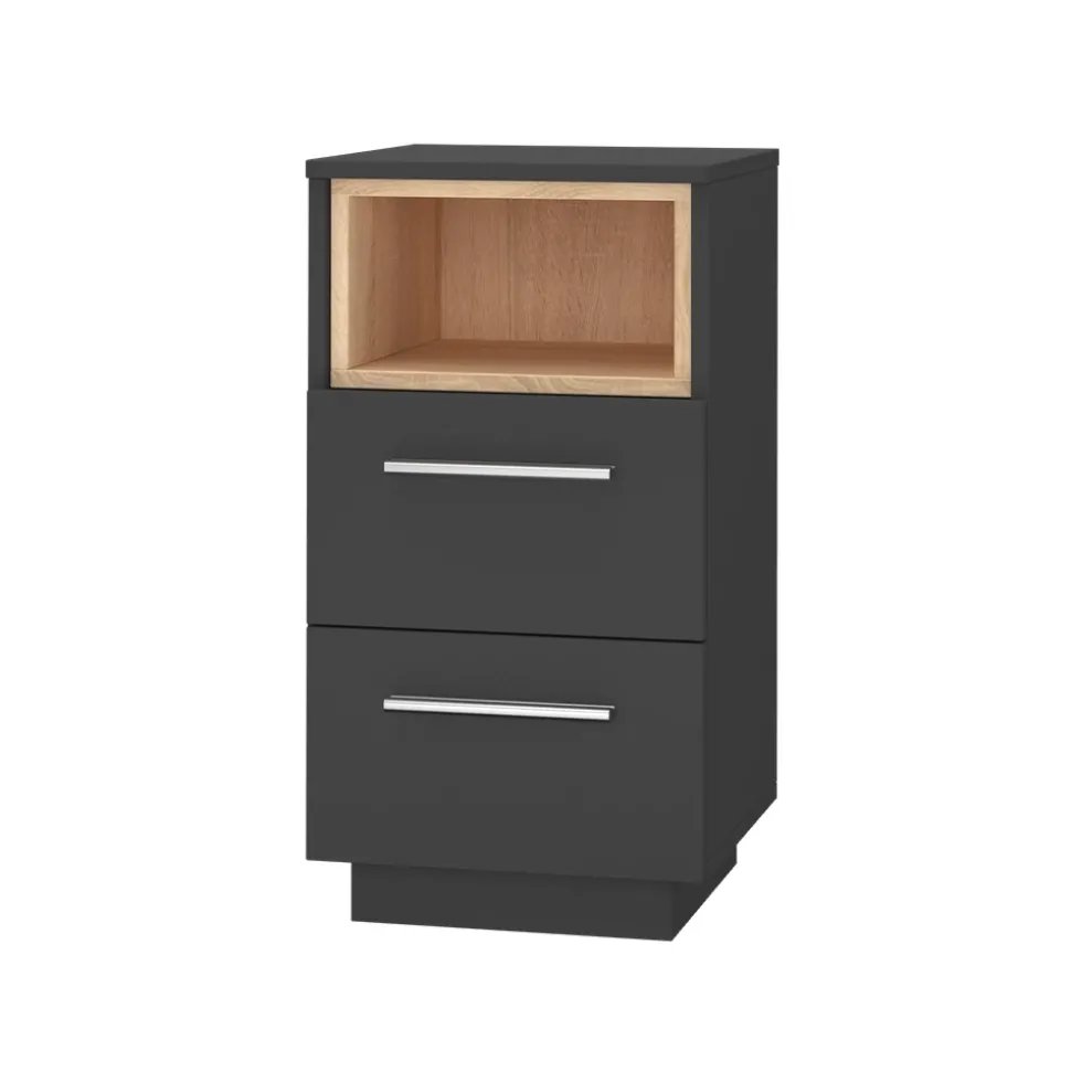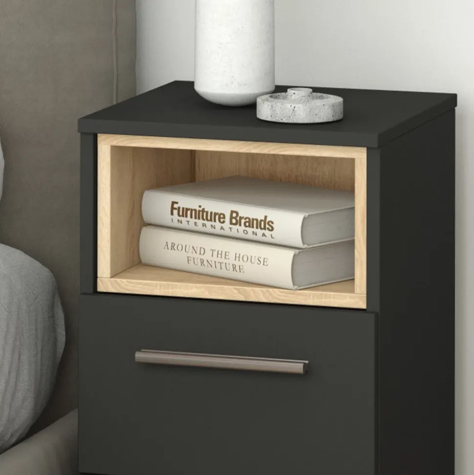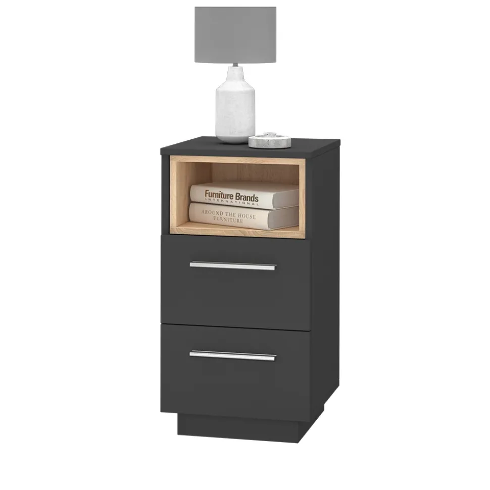 Der Nachttisch Beatrice ist ein wahres Multitalent. Er kann als Nachtschrank, Nachtkommode, Nachttischschrank oder Beistelltisch verwendet werden und bringt mit seinem eleganten Design eine stilvolle Note in jedes Schlafzimmer. Das offene Fach mit einer Holzdekoreinlage ist ideal für Bücher oder eine Lampe, während die soft-close-Schubladen genügend Platz für Ihre persönlichen Habseligkeiten bieten. Die farbkombination aus anthrazit und Sonoma-Eiche macht diesen Nachttisch zu einem wahren Blickfang. Er ist ein Teil der Beatrice-Serie und bietet eine Vielzahl von weiteren Möglichkeiten, um Ihr Zuhause in eine stilvolle Oase zu verwandeln. Gönnen Sie sich den Nachttisch Beatrice und schenken Sie Ihrem Schlafzimmer eine besondere Note.