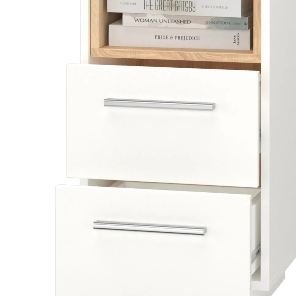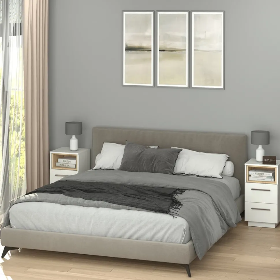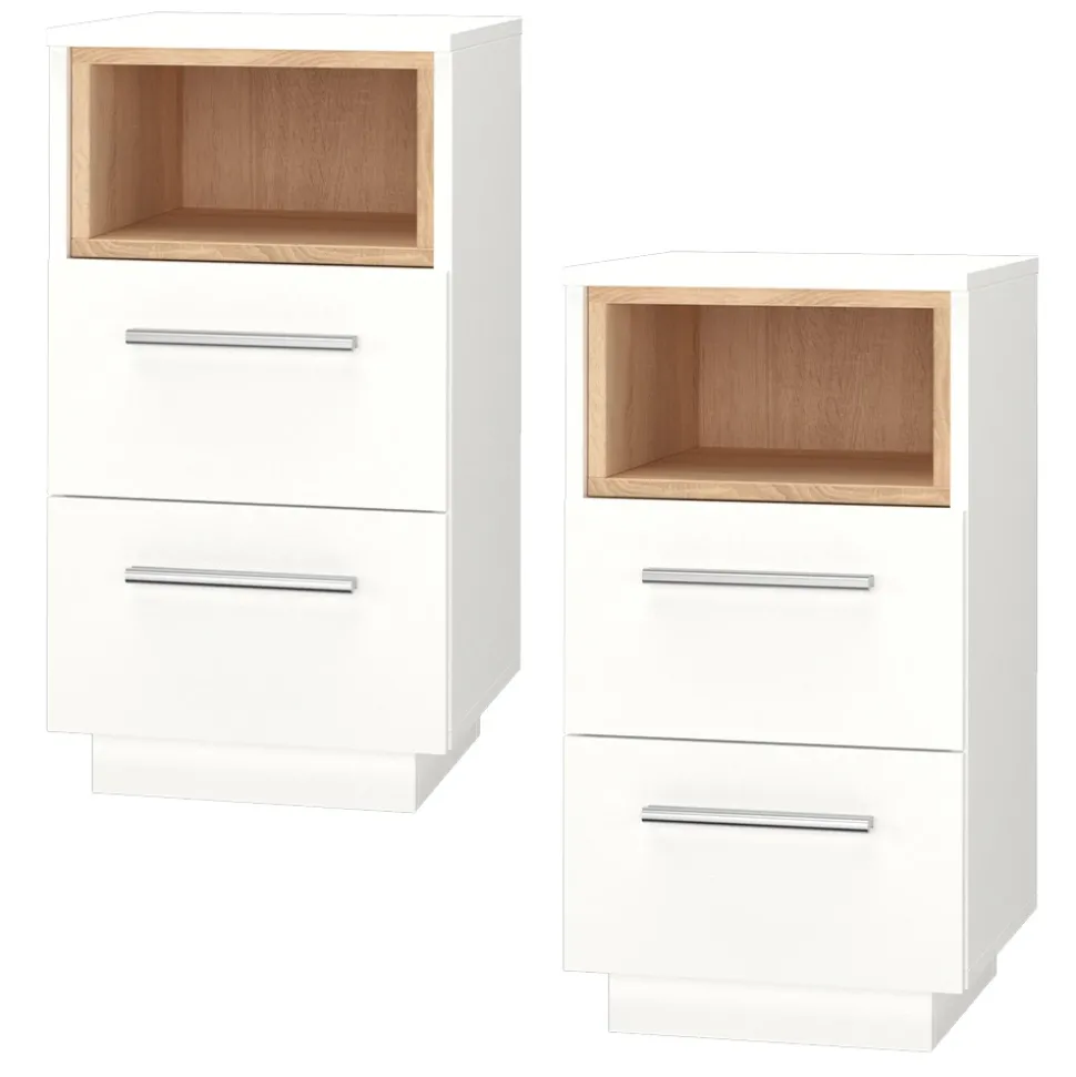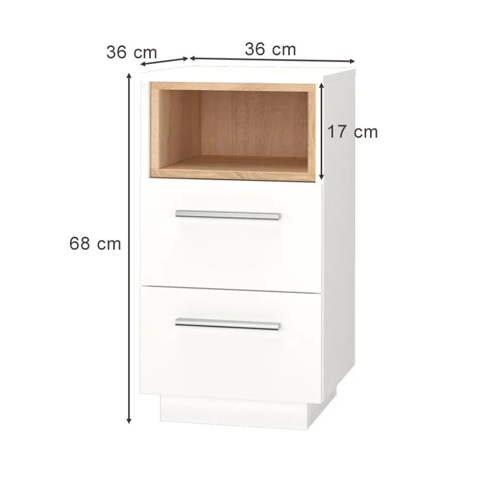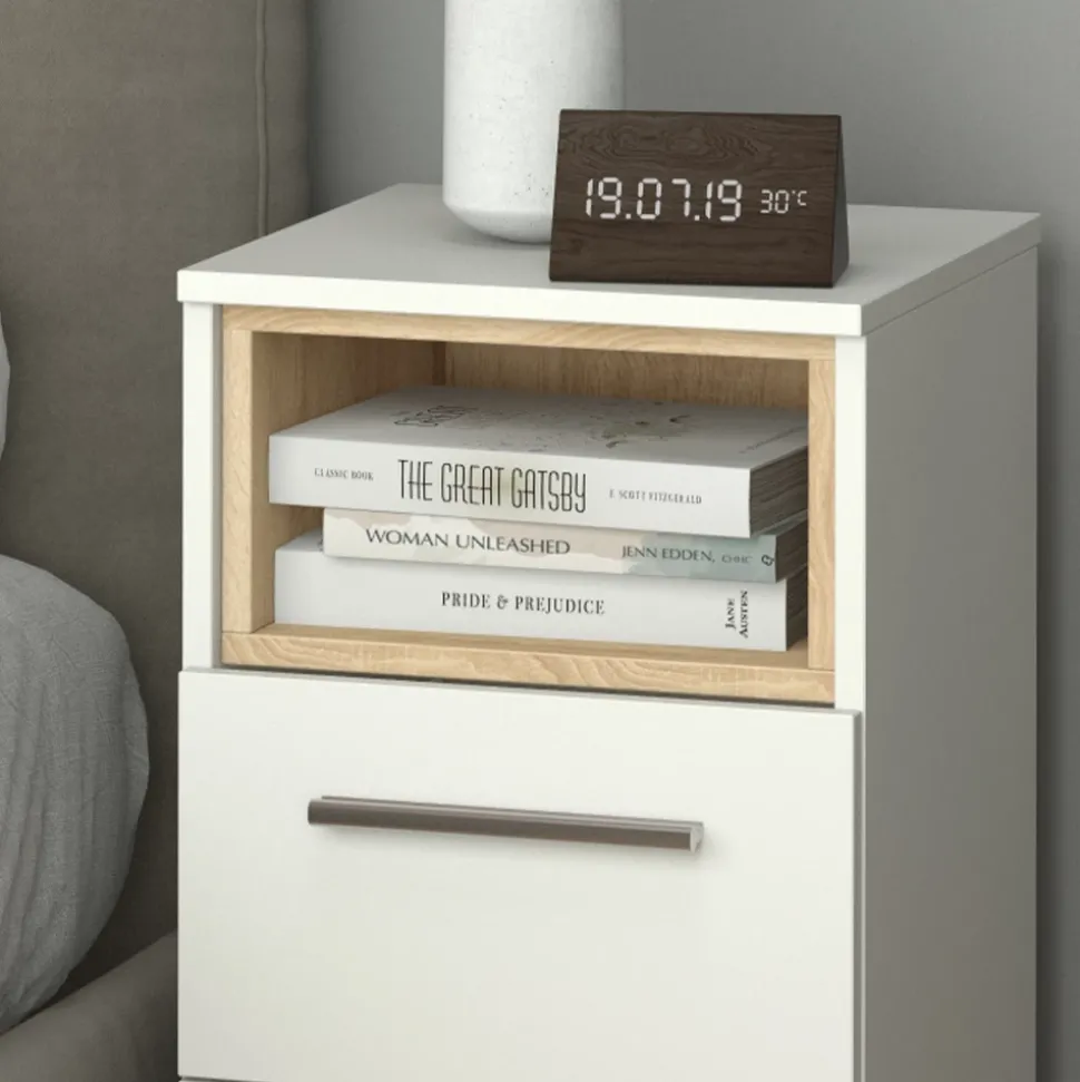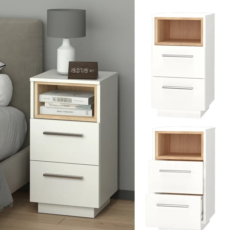 - Die Nachtkommode bietet ein offenes Fach mit Holzdekoreinlage und Soft-Close-Schubladen. Die Farbkombination verleiht ihr eine moderne Optik