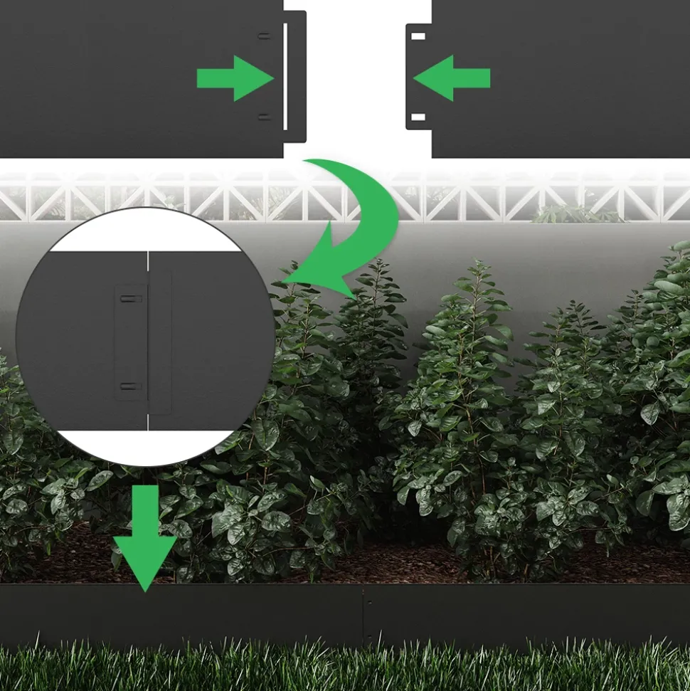 - MAßE: Die Beeteinfassung hat eine Breite von 100 cm, eine Höhe von 14 cm und eine Tiefe von 0,7 cm. Alle detaillierten Größen sind auf den Fotos angegeben.