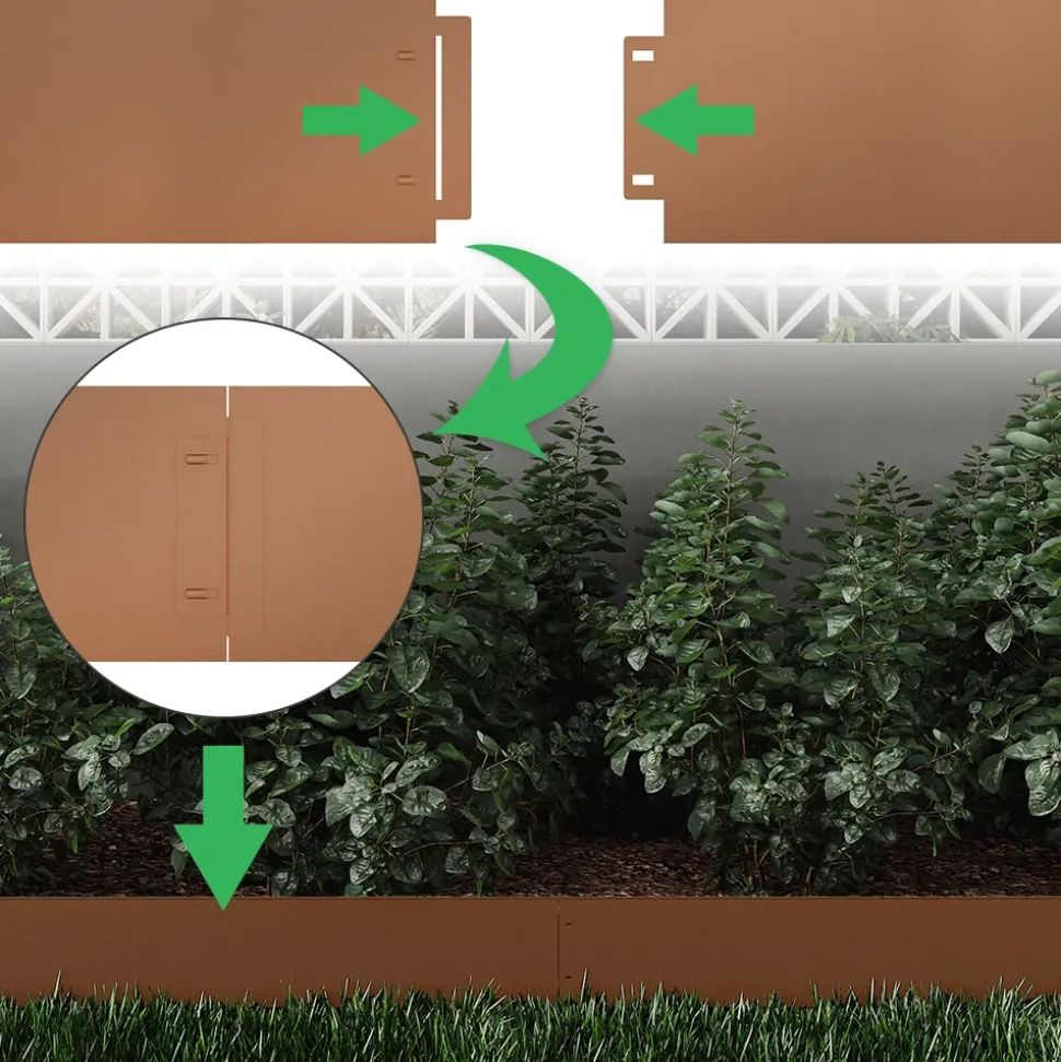 - Die Beetumrandung kann in jede geometrische Form gebogen werden und bietet durch verzinkte Kanten unbegrenzte Verlängerungsmöglichkeiten.