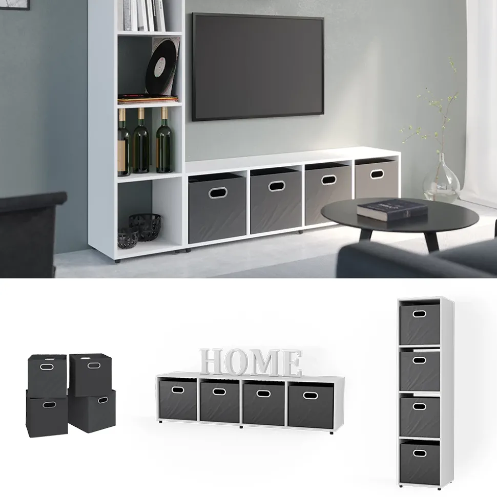 Unser schöner Raumteiler Ludus mit 4 Fächern ist ein flexibles Möbelstück für die unterschiedlichsten Anwendungsmöglichkeiten. Vertikal gestellt als Lowboard für den Fernseher oder als hängendes Wandregal sind nur zwei seiner Varianten. Horizontal kann das Möbelstück als Standregal für CDs, DVDs oder ebenfalls als hängendes Wandregal dienen. Die Faltboxen sind genau die richtigen Helfer in Sachen Ordnung und Aufbewahrung. Gleichzeitig bieten sie eine Vielzahl an Gestaltungsmöglichkeiten und sind eine perfekte Ergänzung zu den unterschiedlichsten Raumteilern. Auch das Herausnehmen aus einem engen Fach wird mit ihnen zum Kinderspiel. Mit Hilfe der im Lieferumfang enthaltenen, bebilderten Montageanleitung ist der Aufbau denkbar einfach!