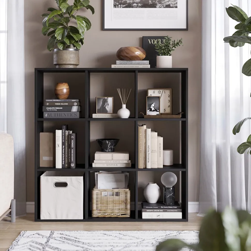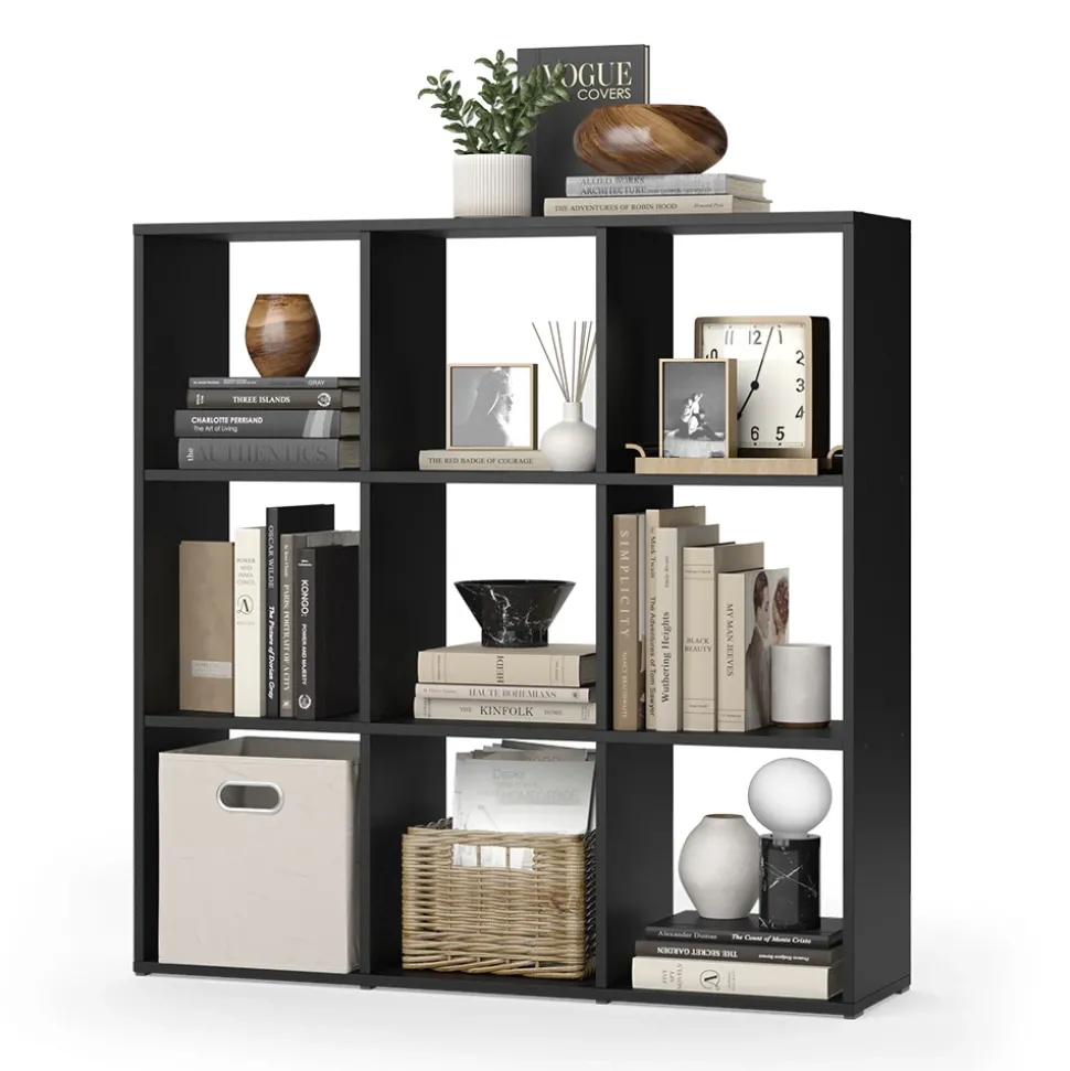 - Das stehende Bücherregal Regal bietet 9 offene Ablagen und Fächer für 30×30 Kartons. Es kann als Raumteiler verwendet werden.