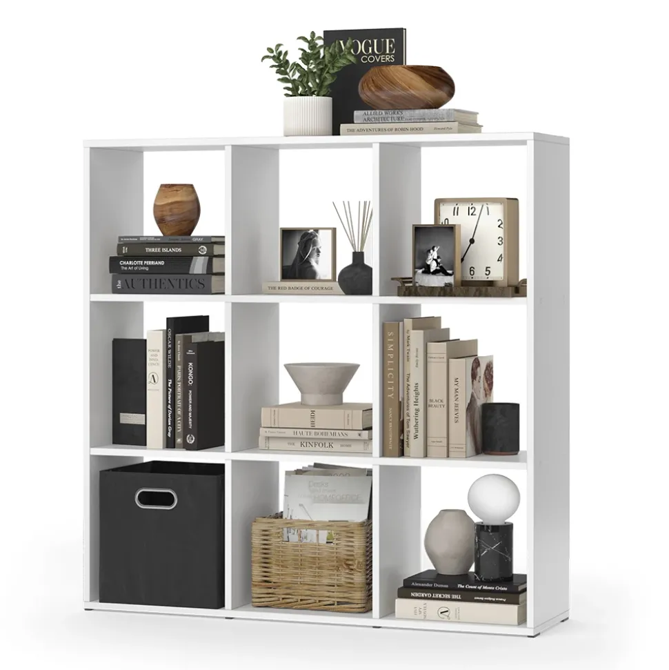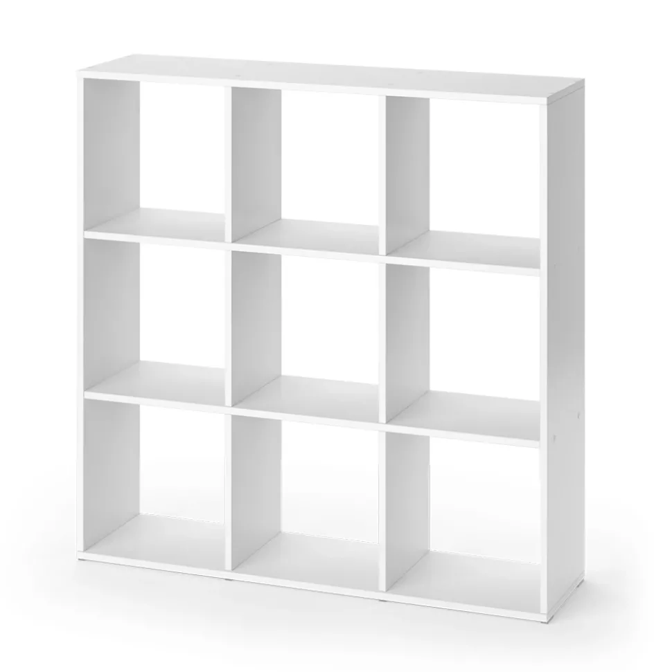 - Das stehende Bücherregal Regal bietet 9 offene Ablagen und Fächer für 30×30 Kartons. Es kann als Raumteiler verwendet werden.