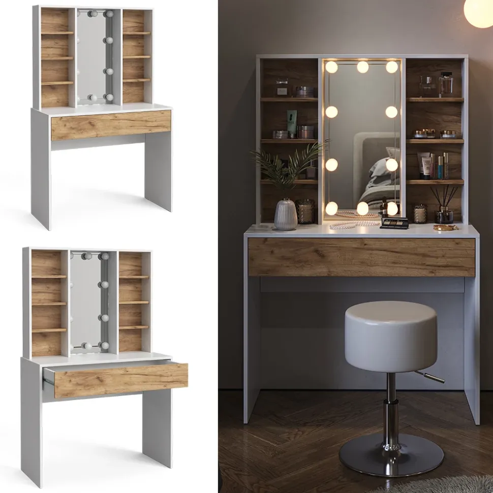 - MATERIAL: Unsere Schminkkommode besteht aus 16 mm Spanplatte. Die LED-Kugeln sind aus Kunststoff gefertigt. Pflegeleicht und langlebig