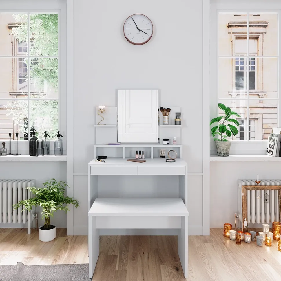 - Der Kosmetiktisch mit Spiegel bietet zahlreiche offene Ablagen und zwei geschlossene Schubladen für eine übersichtliche Aufbewahrung von Make-up und Accessoires.