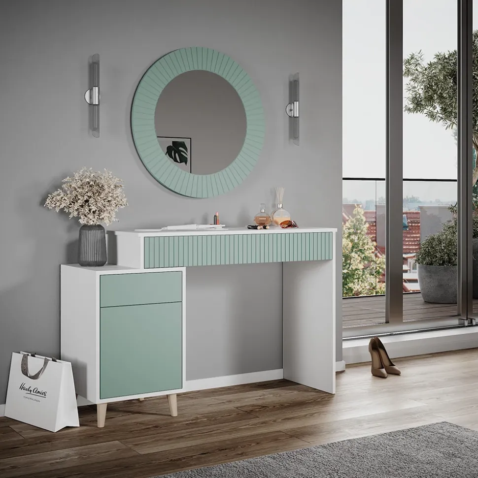 Der Schminktisch Arles ist ein absolutes Must-Have für alle, die sich gerne stilvoll zurechtmachen. Mit seinem eleganten Retro-Design und dem runden Spiegel in einem edlen Rahmen verleiht er jedem Raum das gewisse Extra. Doch nicht nur optisch hat der Kosmetiktisch einiges zu bieten: Mit seinen zwei geschlossenen Regalen und zwei einziehbaren Schubladen bietet er jede Menge Platz für all Ihre Beauty-Produkte und Accessoires. Ob Sie sich für eine Variante in klassischem Weiß oder in einem trendigen Pastellton entscheiden – der Schminktisch Arles wird Sie begeistern! Gönnen Sie sich dieses Schmuckstück und verwandeln Sie Ihr Zuhause in Ihr eigenes Beauty-Paradies!