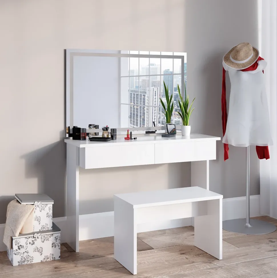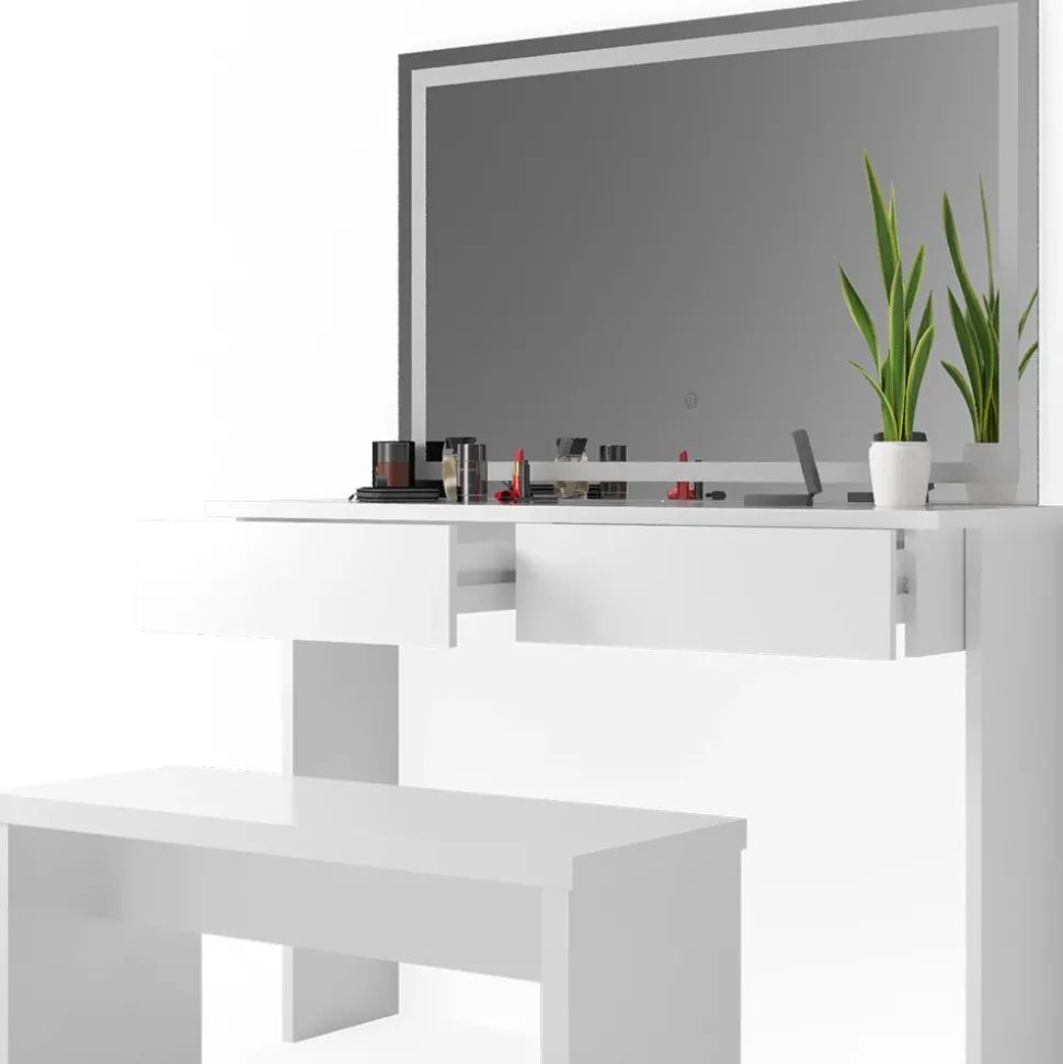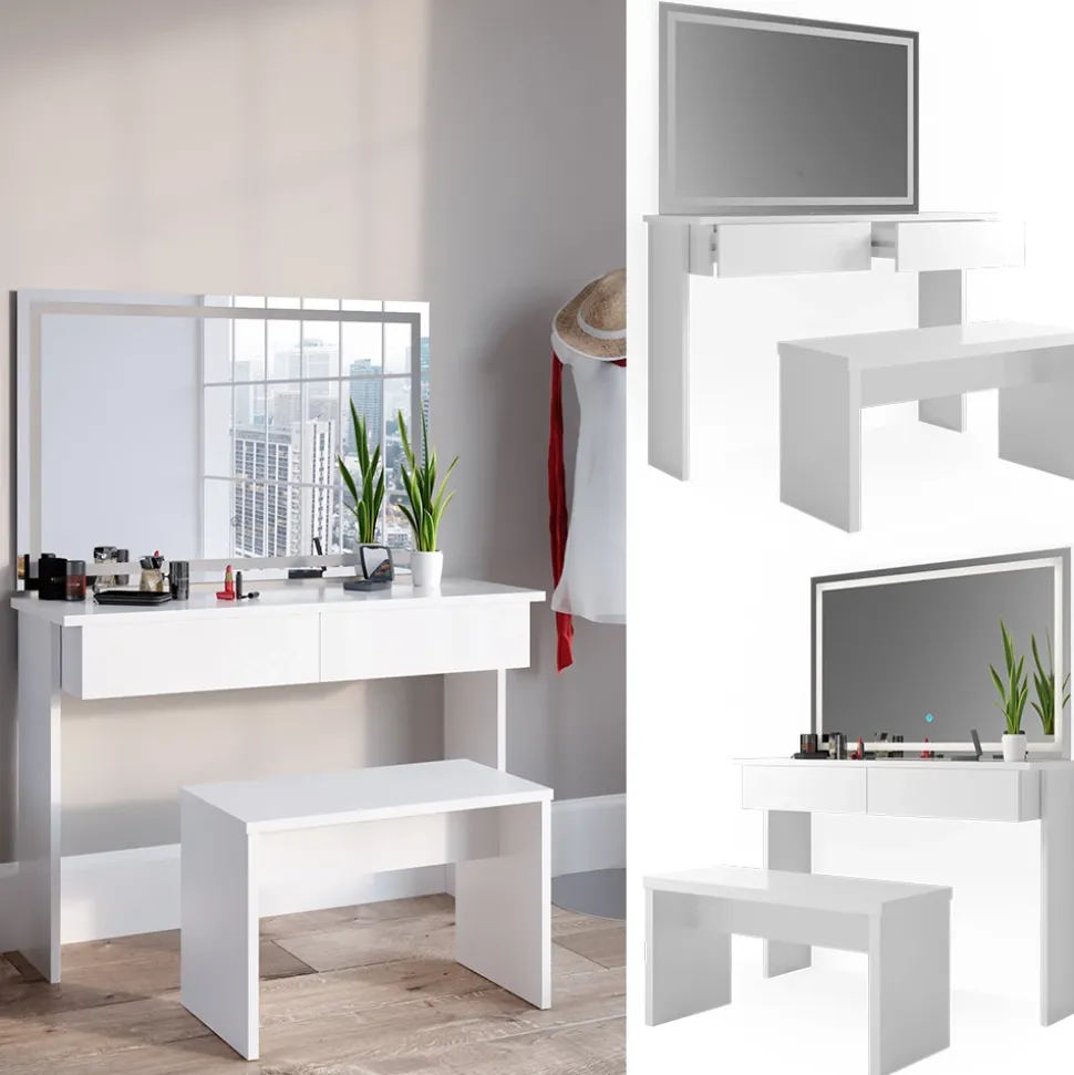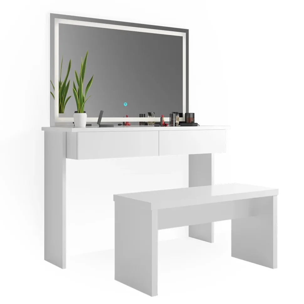 - Dieser Kosmetiktisch mit Spiegel verfügt über ein modernes Design und eine robuste Bank. Der integrierte LED-Spiegel bietet zusätzliche Beleuchtung beim Schminken.