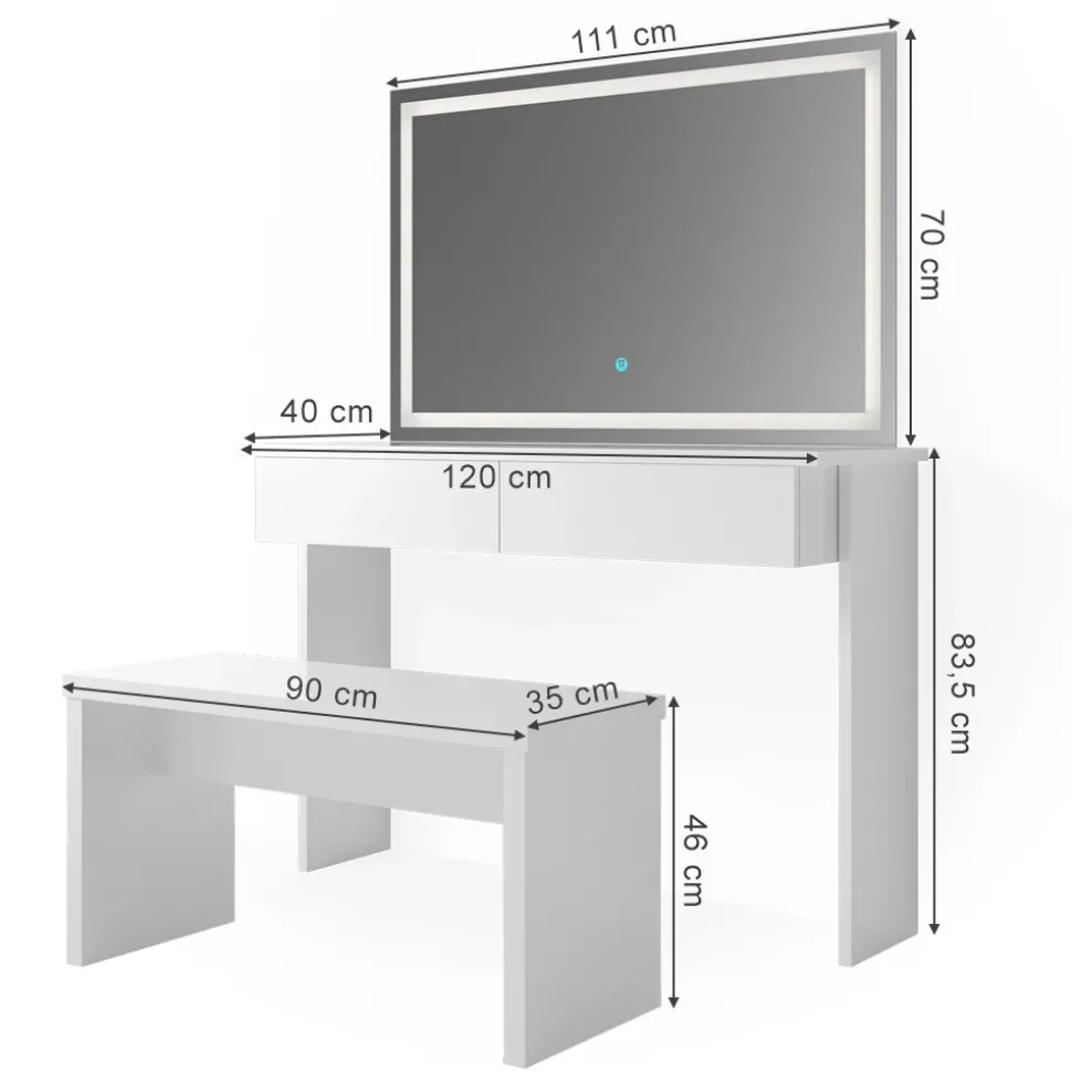 - LIEFERUMFANG: Schminktisch, LED-Spiegel, Sitzbank, Montageanleitung, Montagematerial