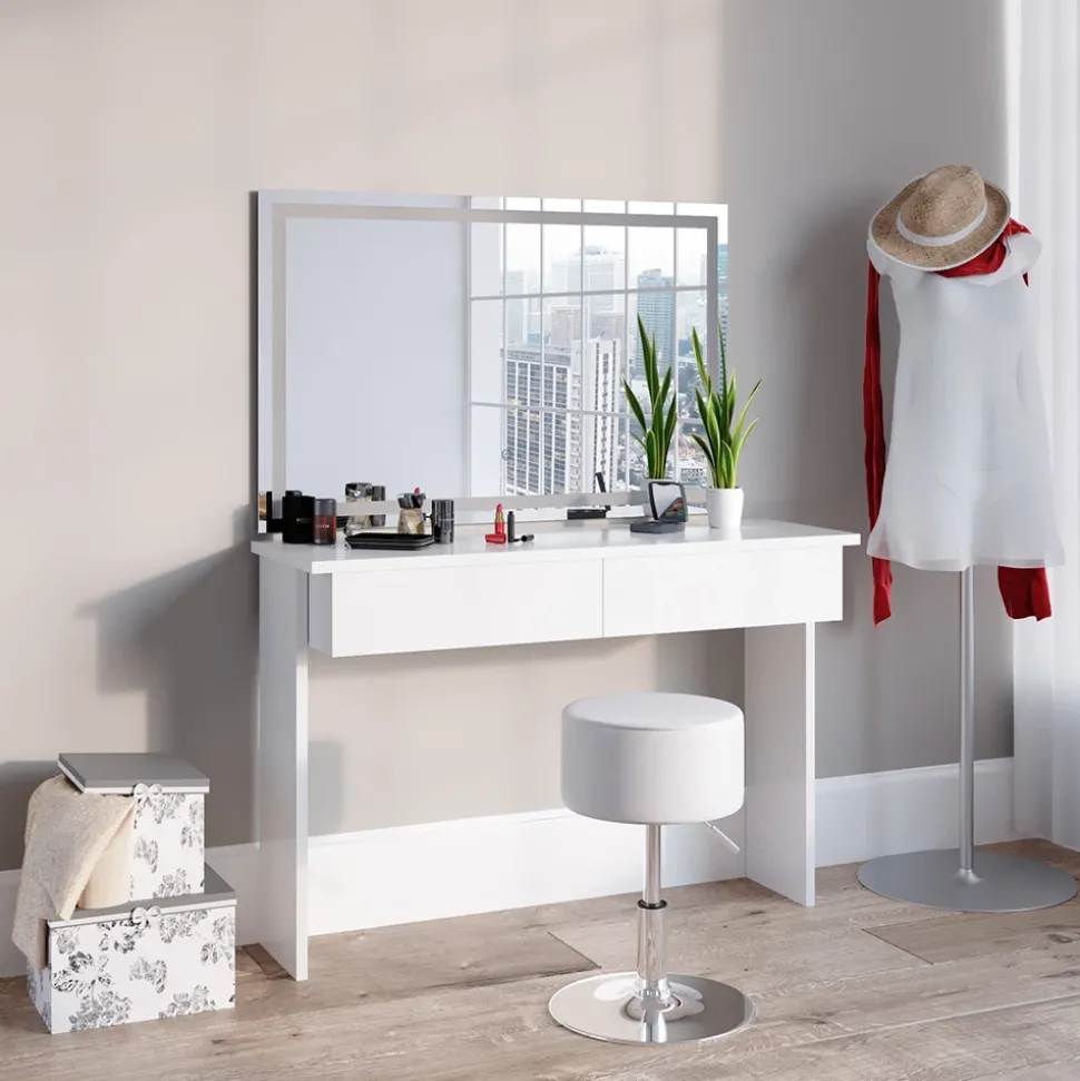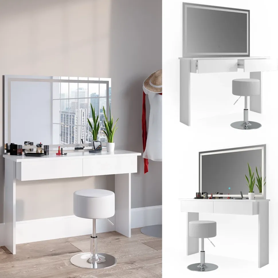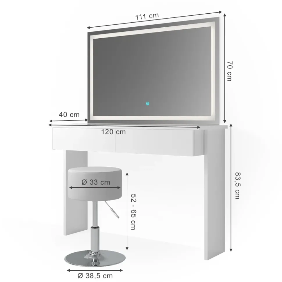 - Der Kosmetiktisch mit LED-Spiegel Azur, Weiß ist mit zwei ausziehbaren Schubladen und einem großen rechteckigen Spiegel ausgestattet.