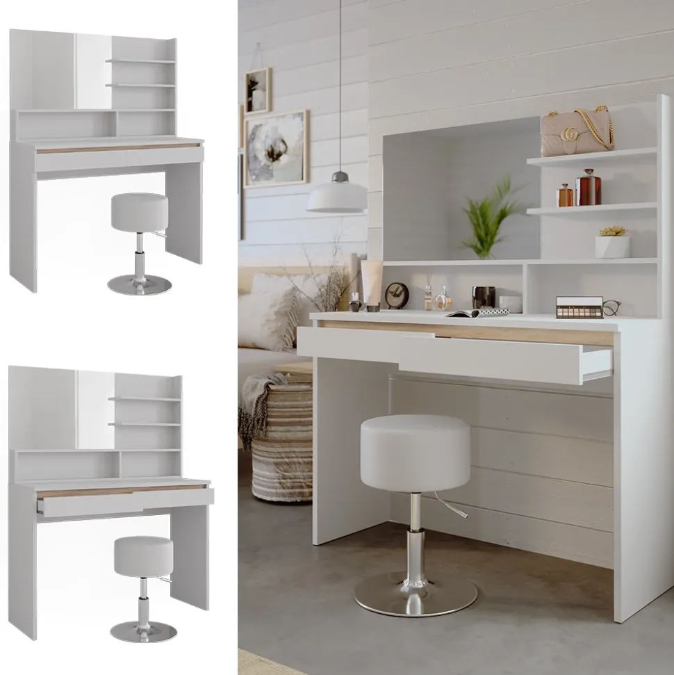 - Die Kosmetiktisch mit Spiegelregal und Hocker „Emma“ ist die optimale Wahl für jede Wohnung. Mit ihrem stilvollen Design ist sie einfach zu bedienen und ein echter Hingucker.