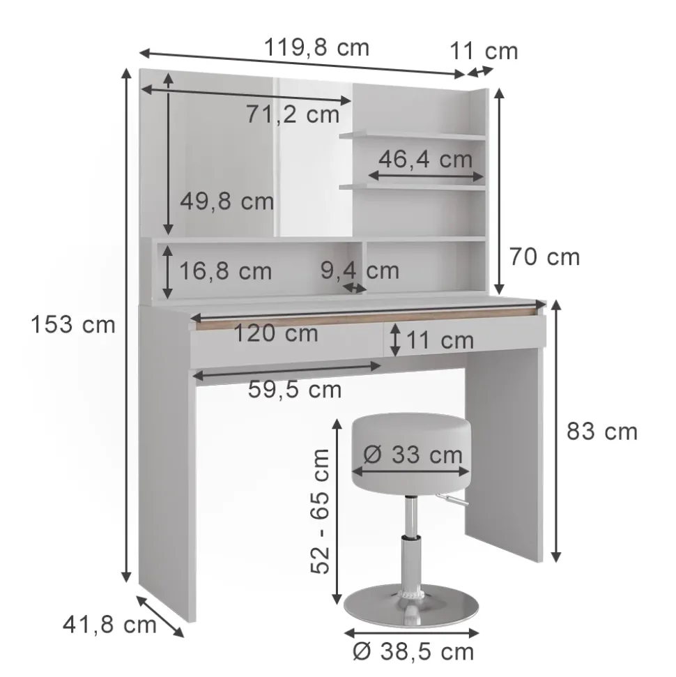 Schminktisch: 120 x 83 x 41.8 cm (BxHxT)