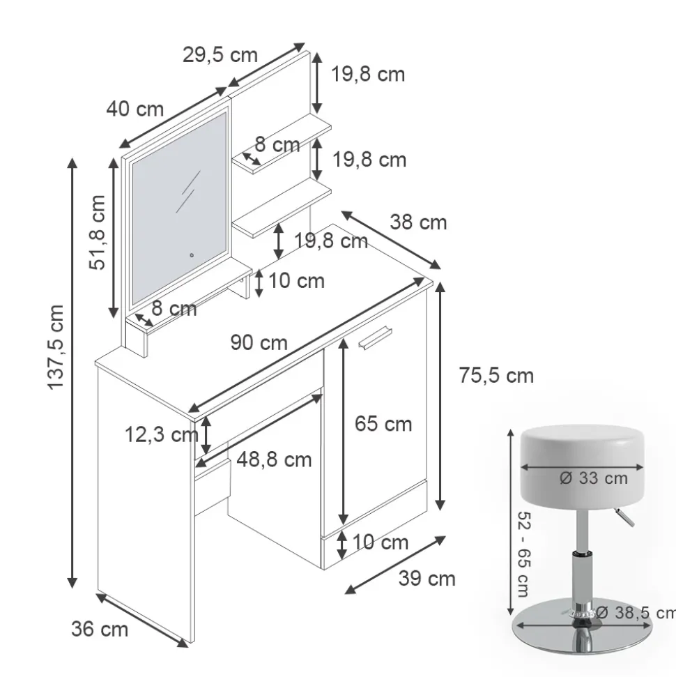 - LIEFERUMFANG: Schminktisch, LED-Spiegel, Hocker, Montageanleitung, Montagematerial