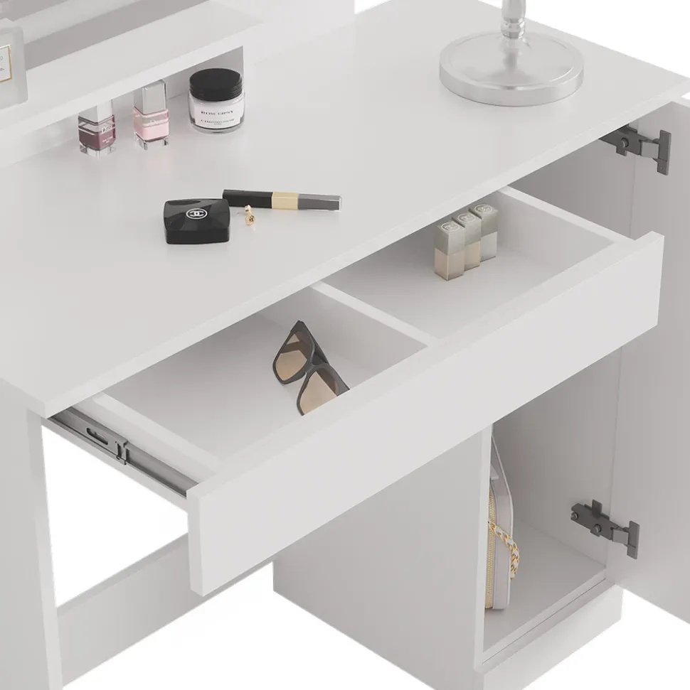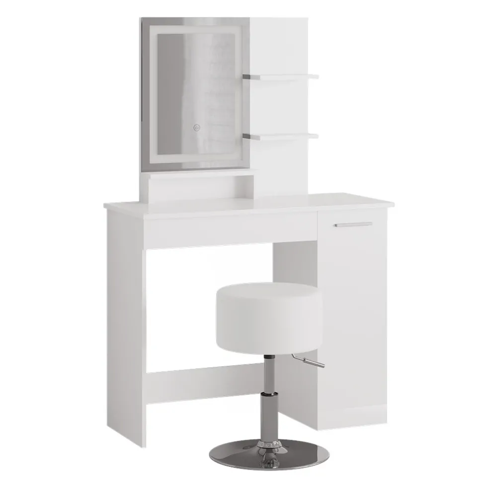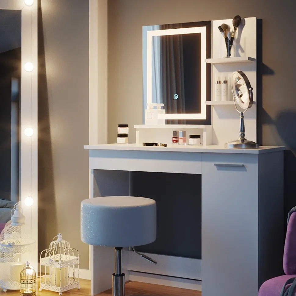 Ein Schminktisch ist ein Ort, an dem sich Frauen am liebsten aufhalten. Es ist ein Ort zum Träumen, Entspannen und Kreativsein. Der Schminktisch Julia bietet alles, was das Herz einer Frau begehrt. Dieser klassische Schminktisch ist ein wahres Schmuckstück und verleiht Ihrem Schlafzimmer eine elegante Note. Der LED-Spiegel und der bequeme Hocker laden zum Sitzen und Schminken ein. Schmuck, Parfüm und Make-up finden in den drei offenen und drei geschlossenen Fächern einen Platz. Aber das ist noch nicht alles, denn dieses Schminktischmodell ist in verschiedenen Ausführungen erhältlich, um Ihren persönlichen Stil zu unterstreichen. Gönnen Sie sich einen Ort der Schönheit und verzaubern Sie Ihr Zuhause mit dem Schminktisch Julia.