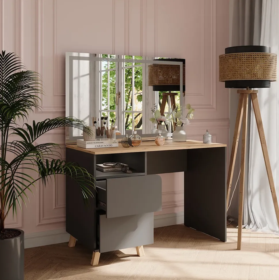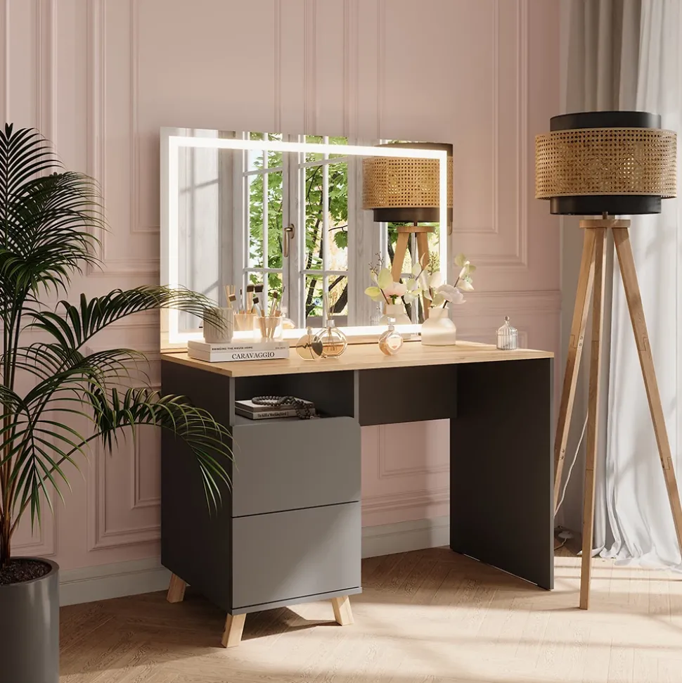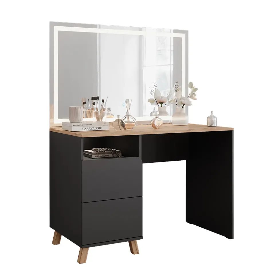 - Der Kosmetiktisch besticht durch seine modernen Holzbeine und bietet viel Stauraum. Ein stilvoller Begleiter für die tägliche Beauty-Routine.
