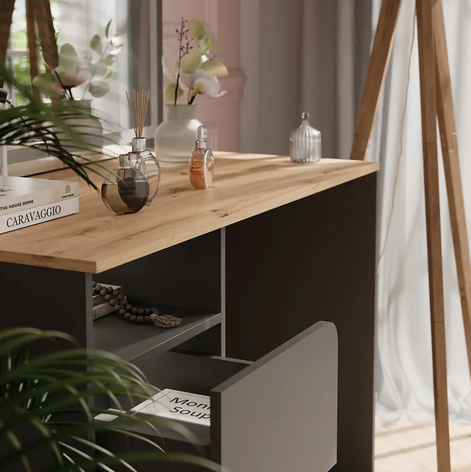 - MATERIAL: Der Kosmetiktisch Karen besteht aus 16 mm Spanplatte mit Melaminharzbeschichtung für einfache Pflege und Reinigung.