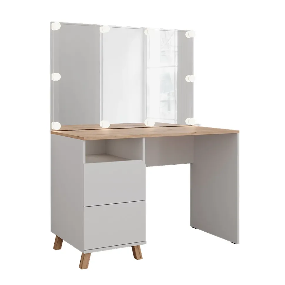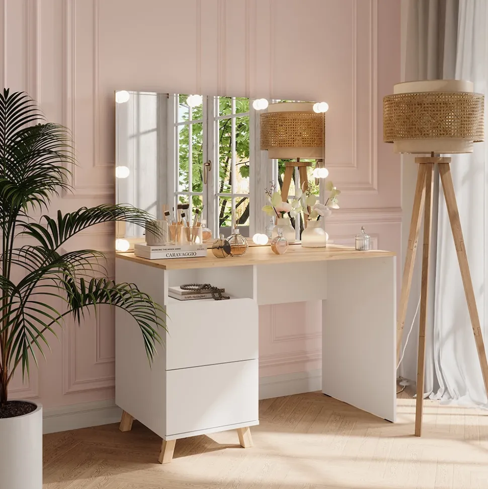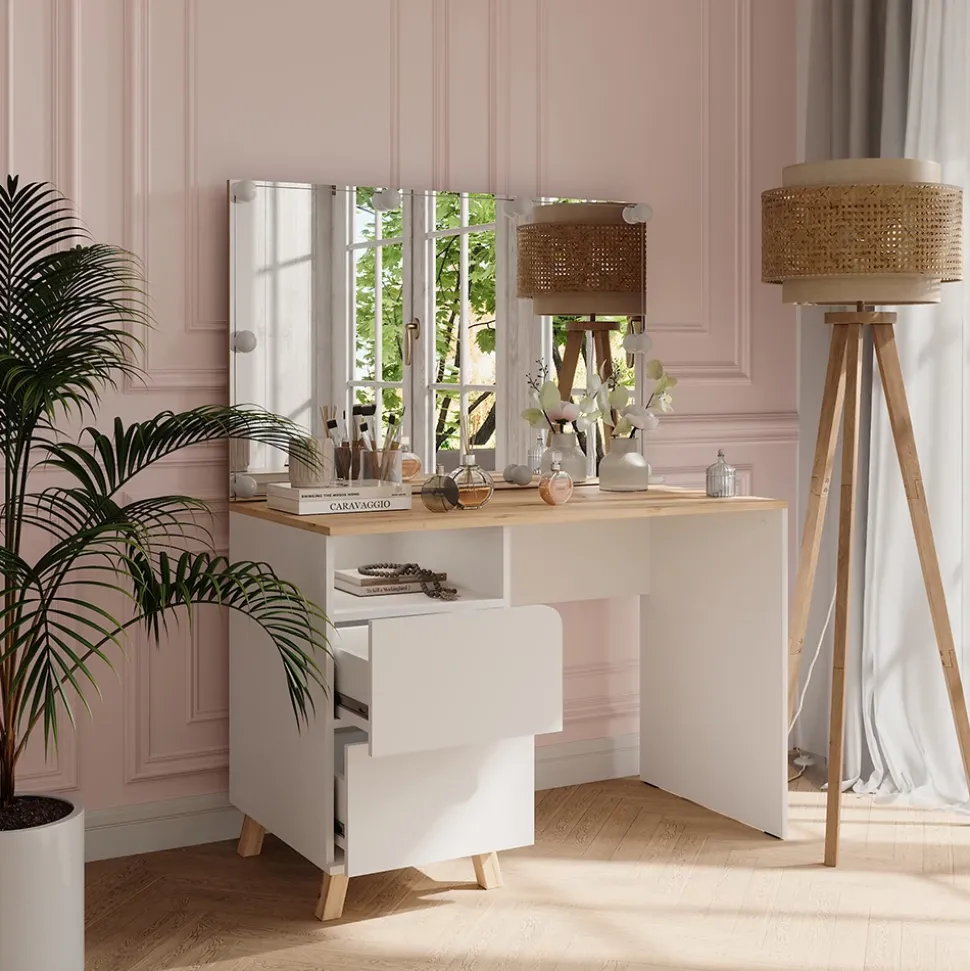 - Der Kosmetiktisch besticht durch seine modernen Holzbeine und bietet viel Stauraum. Ein stilvoller Begleiter für die tägliche Beauty-Routine.