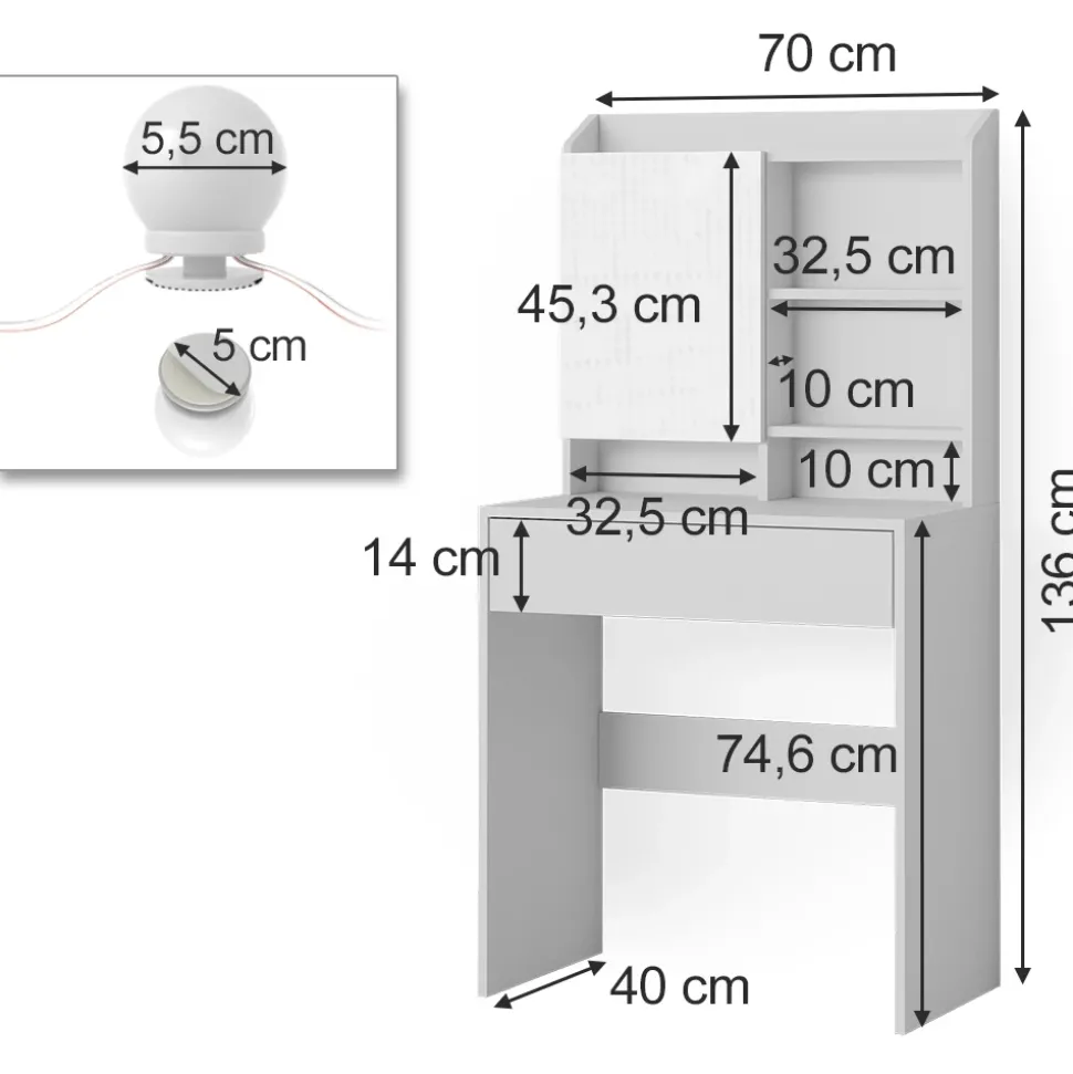 - MAßE: Der Frisiertisch hat eine Breite von 70 cm, eine Höhe von 136 cm und eine Tiefe von 40 cm. Alle detaillierten Größen sind auf den Fotos angegeben.