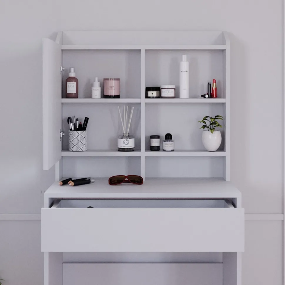 - Der Kosmetiktisch mit Spiegel in Weiß bietet mehrere offene Ablagen und ein geschlossenes Regal, sowie eine robuste Konstruktion und einen eleganten rechteckigen Spiegel.