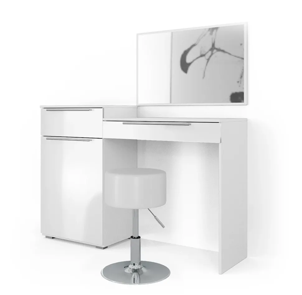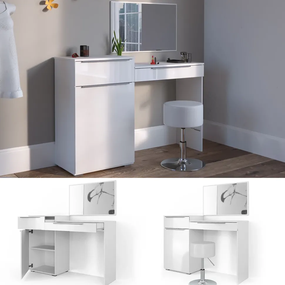- Der Kosmetiktisch mit Spiegel in Weiß Hochglanz bietet eine robuste Konstruktion und praktische geschlossene Ablagen für eine geordnete Aufbewahrung.