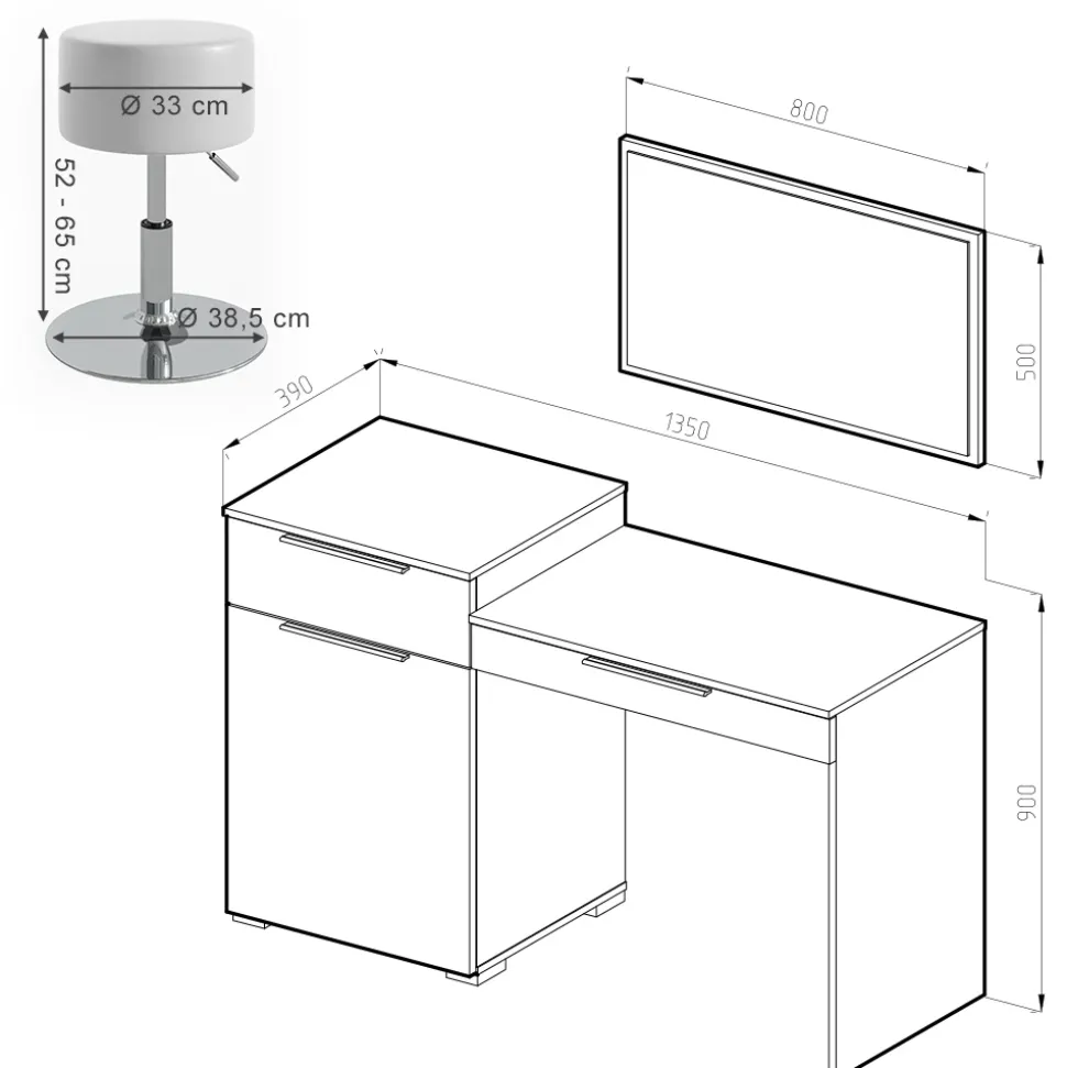 - MAßE: Der Frisiertisch hat eine Breite von 135 cm, eine Höhe von 90 cm und eine Tiefe von 39 cm. Alle detaillierten Größen sind auf den Fotos angegeben.