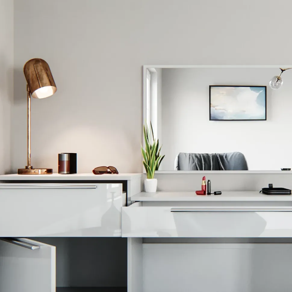 Die Möbelserie „Lilli“ bietet verschiedene Optionen von Schminktischen in verschiedenen Konfigurationen. Mit einer breiten Auswahl an Möglichkeiten können Sie einen einzigartigen und funktionalen Bereich für Ihre Schönheitsroutine schaffen.