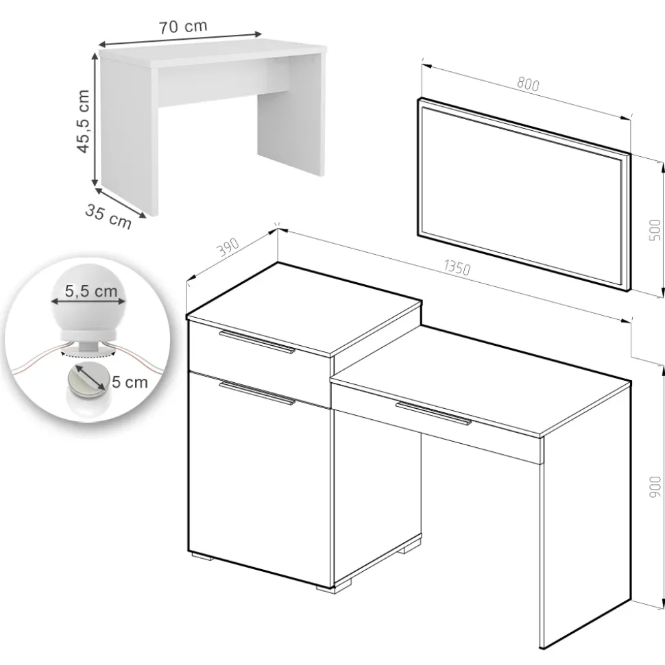 - MAßE: Der Frisiertisch hat eine Breite von 135 cm, eine Höhe von 90 cm und eine Tiefe von 39 cm. Alle detaillierten Größen sind auf den Fotos angegeben.