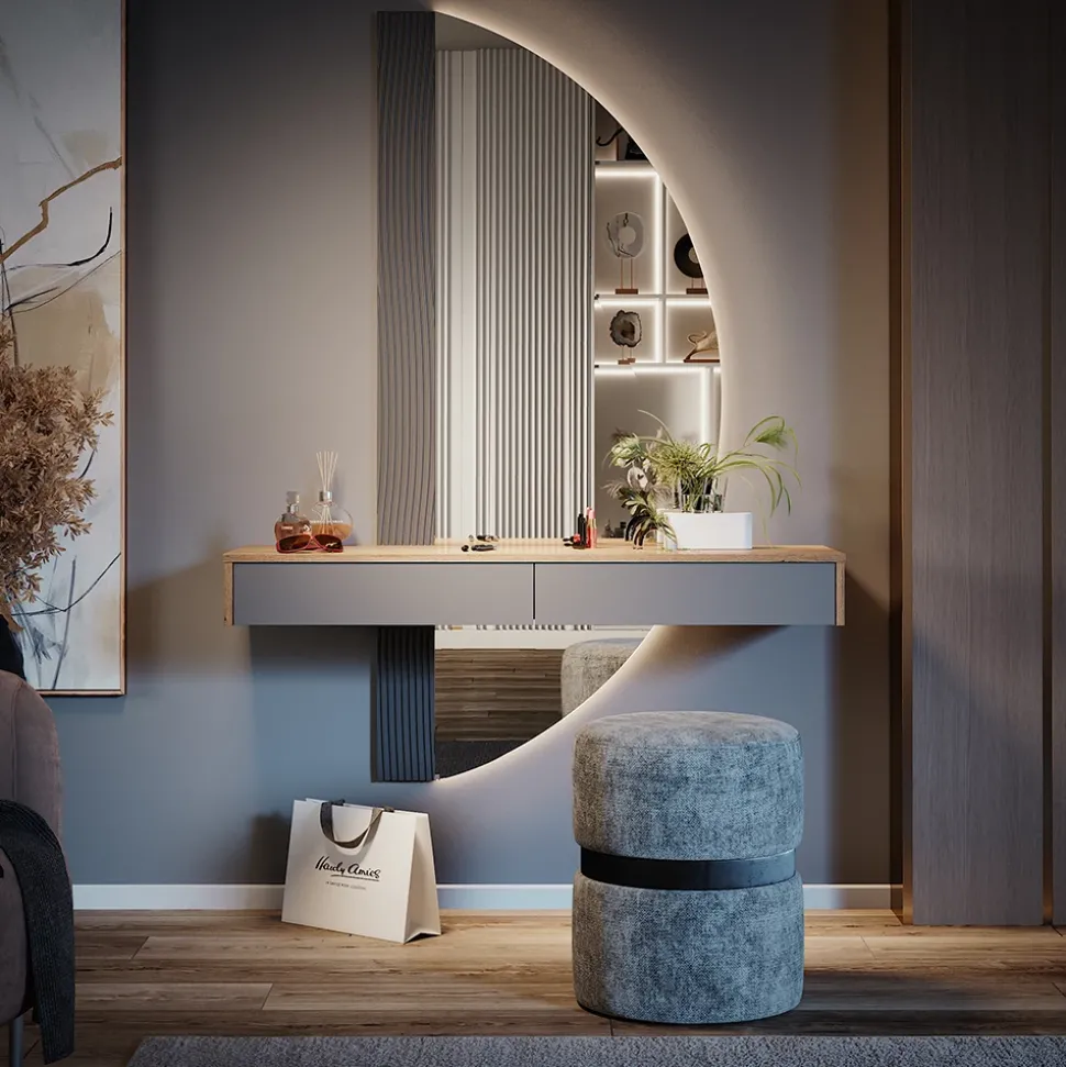 Die „Melisa“-Möbelserie umfasst elegante Frisiertische, die durch ihre zeitlose Ästhetik und raffinierte Gestaltung eine harmonische Ergänzung zu jedem Raum bieten.