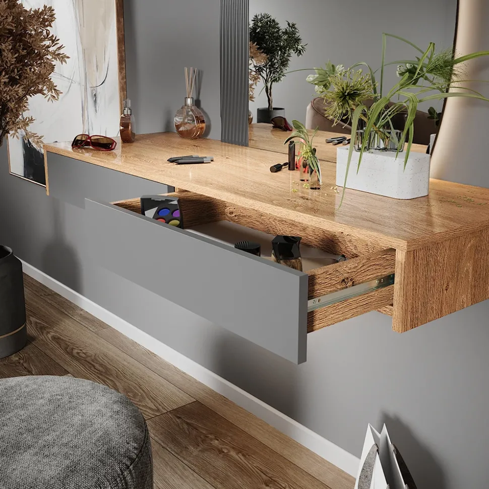 - Entdecken Sie den Schminktisch Melisa in Eiche-Grau. Dieser Schminktisch mit großzügigem Spiegel ist eine elegante Ergänzung für Ihr Schlafzimmer.