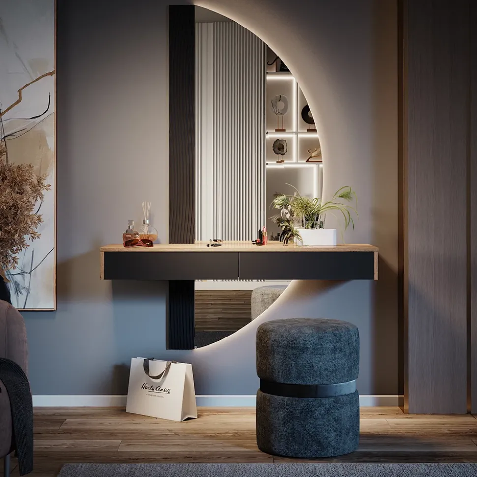 Die „Melisa“-Möbelserie umfasst elegante Frisiertische, die durch ihre zeitlose Ästhetik und raffinierte Gestaltung eine harmonische Ergänzung zu jedem Raum bieten.