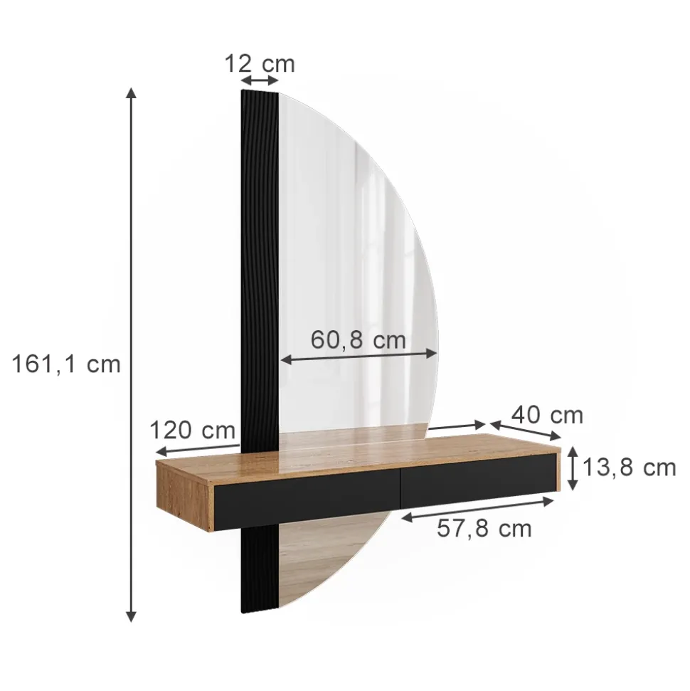 - MAßE: Der Frisiertisch hat folgende Abmessungen: Breite: 120 cm, Höhe: 161,1 cm, Tiefe: 40 cm. Alle detaillierten Größen sind auf den Fotos angegeben.
