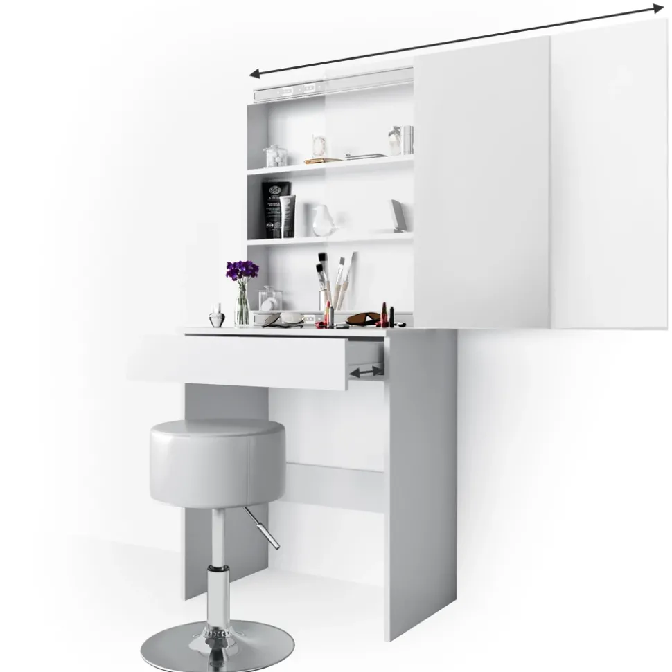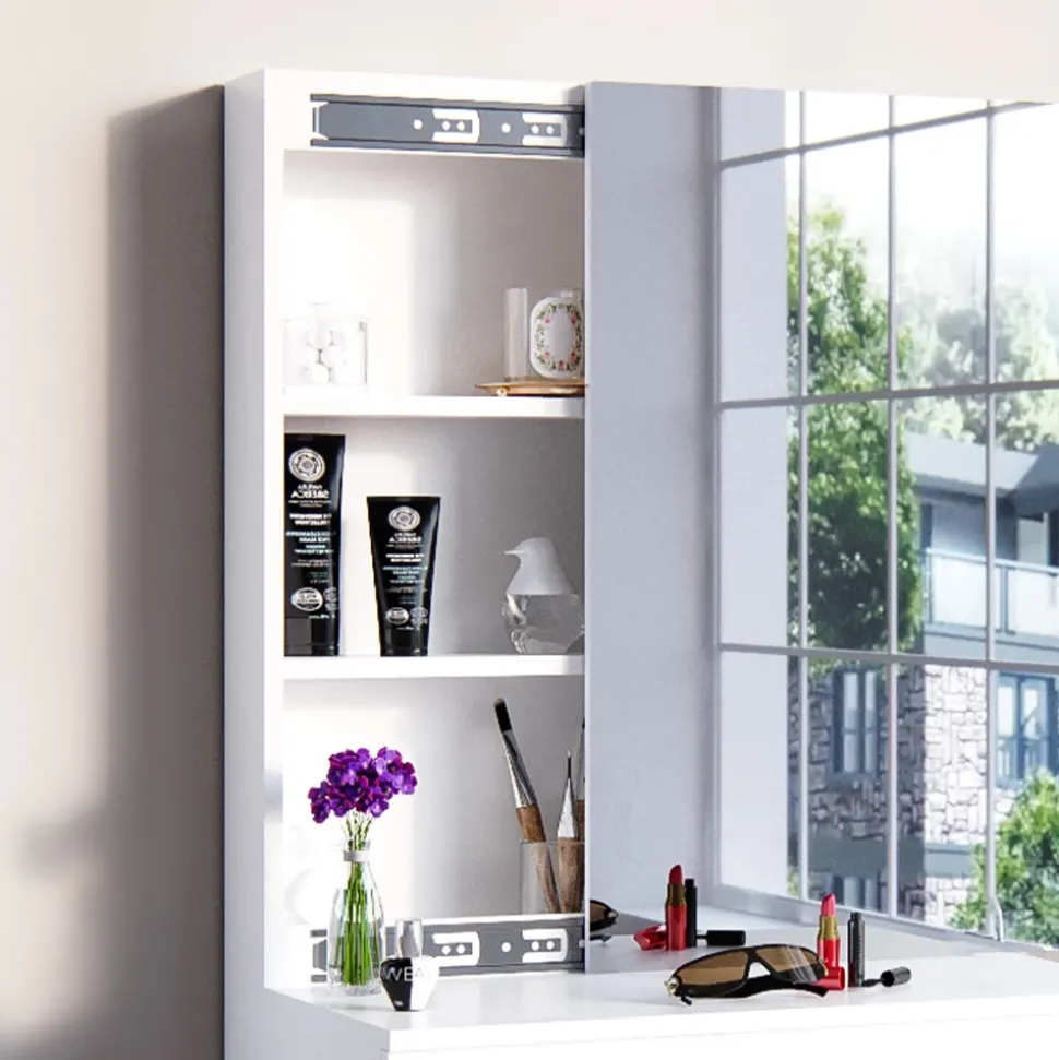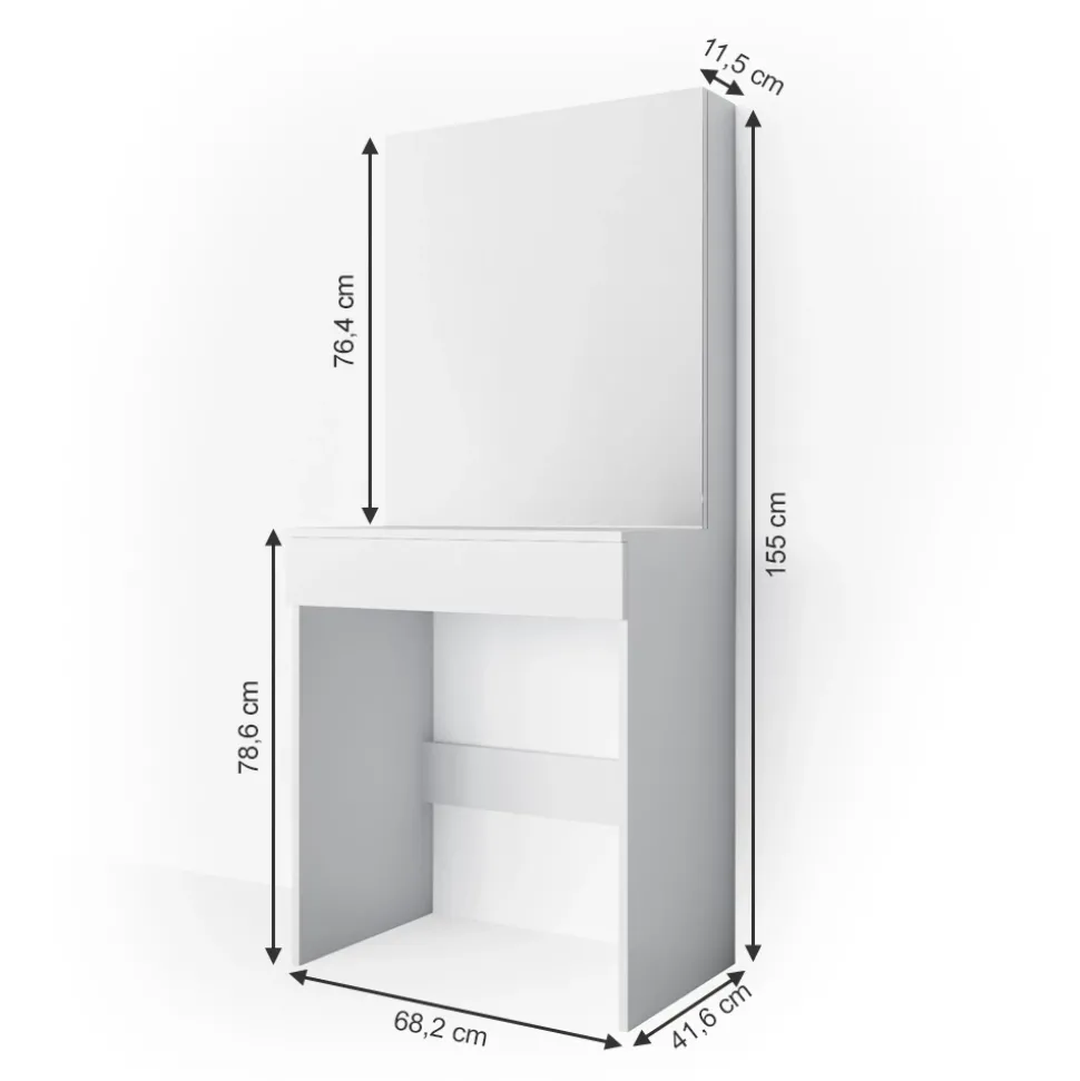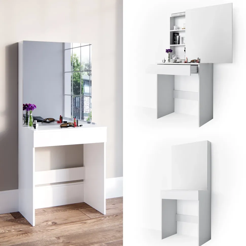 - Frisiertisch Melle ist mit einer pflegeleichten bietet einen Spiegelschrank mit Schiebetür und 3 Fächern sowie eine große Schublade.