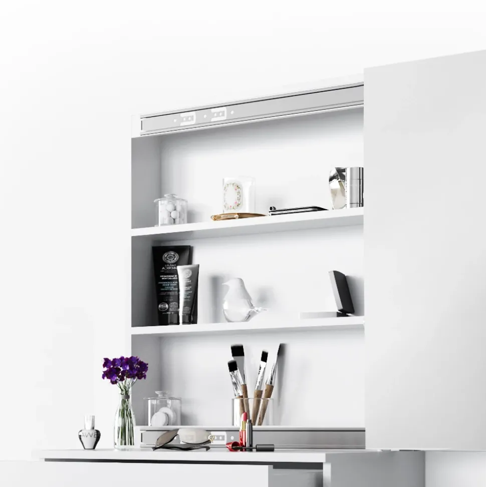 Der moderne Kosmetiktisch Melle wird Ihr Traumpartner für die tägliche Schminkroutine. Schmuck, Beauty- und Styling-Artikel finden im Spiegelschrank, der geräumigen Schublade oder auf der Tischfläche ihren Platz. Der Spiegelschrank lässt sich durch die Teleskopführungen bequem zur Seite öffnen, ohne, dass Sie Ihre Routine durch langes Umräumen der Utensilien unterbrechen müssen. Die gradlinige Optik macht den Schminktisch zu einem stilsicheren Möbelstück, das jeden Raum aufwertet. Der große Spiegel wird Sie in einem noch glanzvolleren Licht erstrahlen lassen!