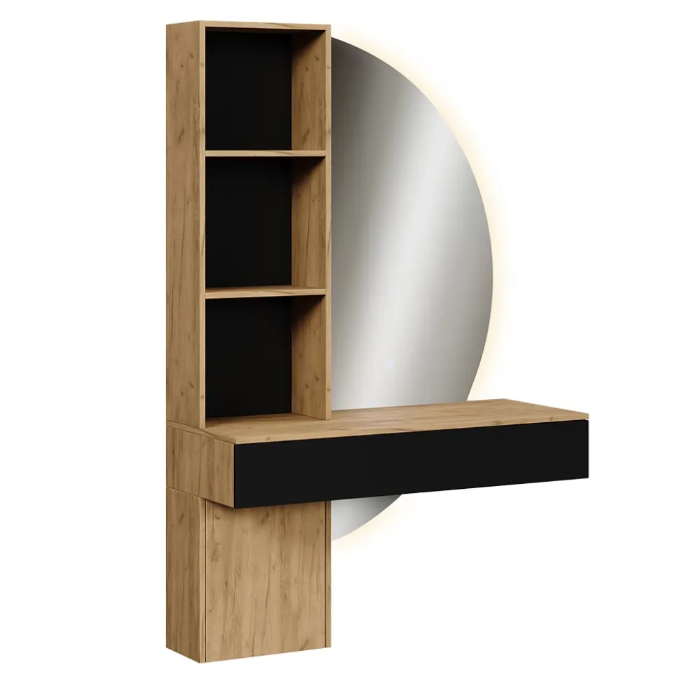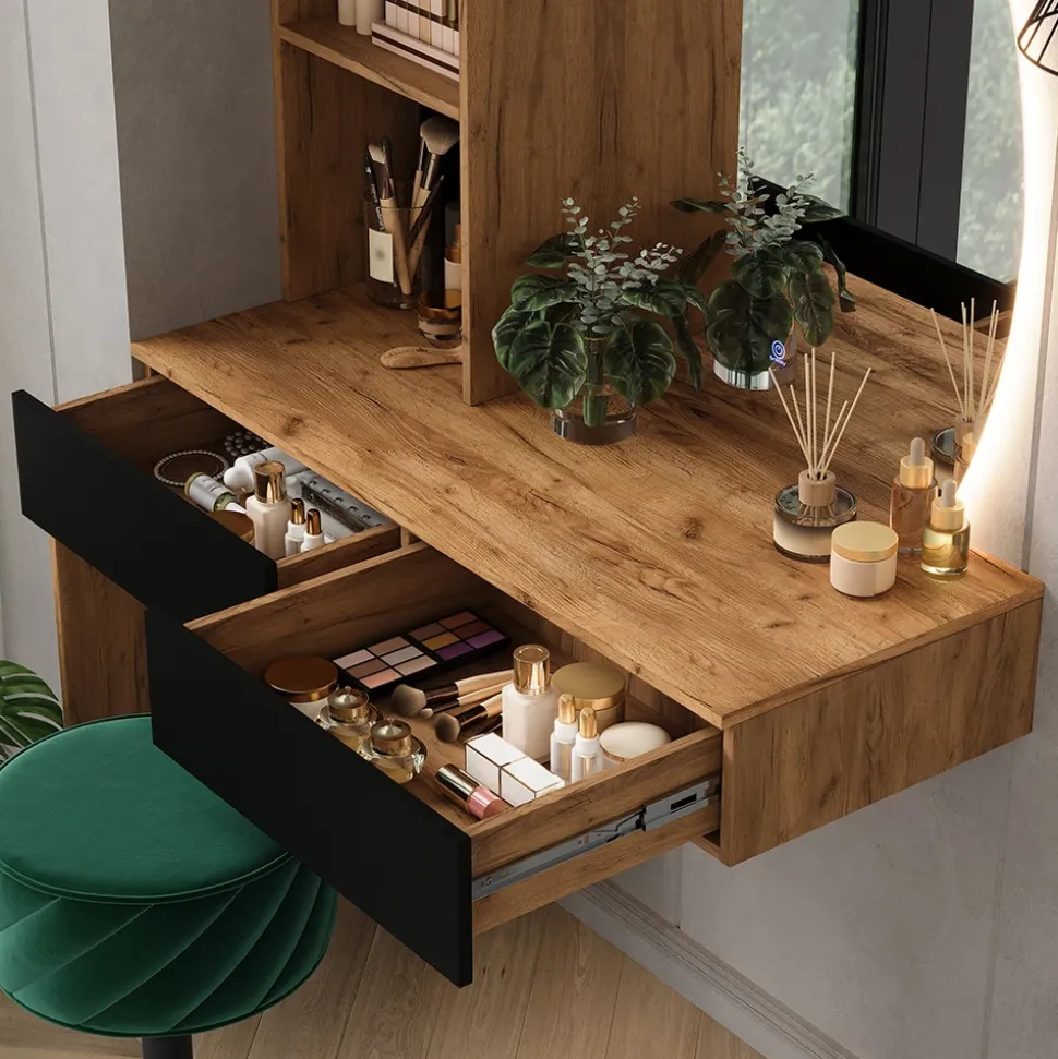 Der Schminktisch Melora ist mehr als nur ein Möbelstück – er ist der perfekte Ort für Ihre täglichen Rituale und sorgt für Momente des persönlichen Wohlbefindens. Mit seinem durchdachten Design bietet er großzügigen Stauraum für all Ihre Kosmetikprodukte und Accessoires, während der LED-Spiegel mit sanfter Beleuchtung Ihr Licht ins beste Glamour-Helferlein verwandelt. Stellen Sie sich vor, wie Sie am Morgen bei einer Tasse Kaffee vor diesem stilvollen Tisch sitzen, sich auf den Tag vorbereiten und Ihr Selbstbewusstsein aufbauen. Ideal für kleine Räume, bringt Melora ein Stück Freude und Eleganz in Ihr Zuhause. Verwandeln Sie Ihr Ritual in ein tägliches Highlight!