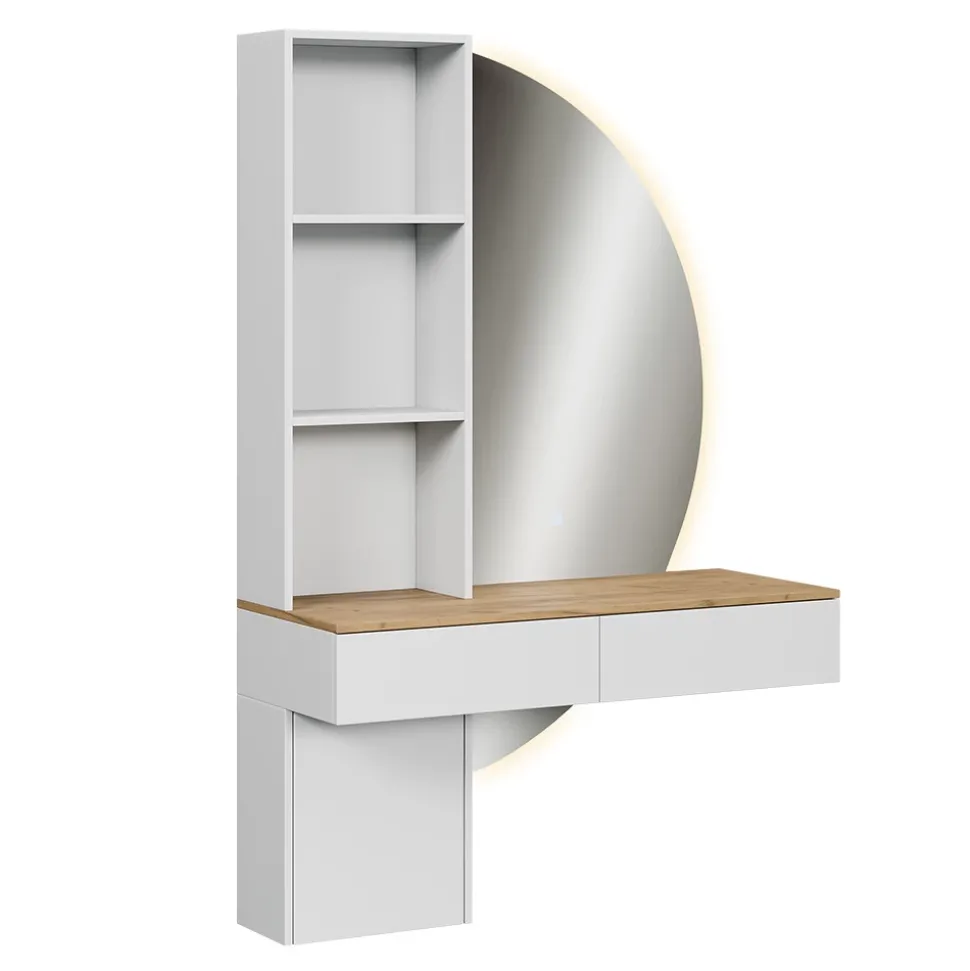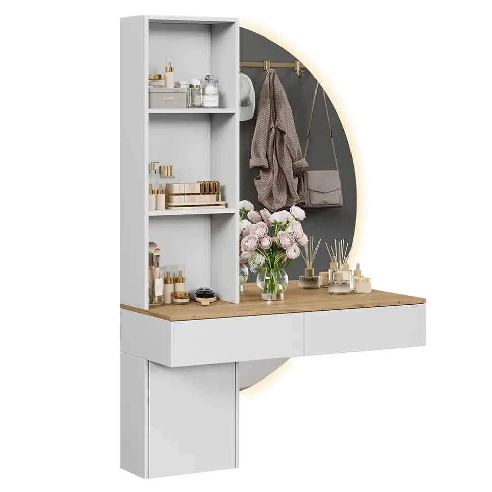 Der Schminktisch Melora ist mehr als nur ein Möbelstück – er ist der perfekte Ort für Ihre täglichen Rituale und sorgt für Momente des persönlichen Wohlbefindens. Mit seinem durchdachten Design bietet er großzügigen Stauraum für all Ihre Kosmetikprodukte und Accessoires, während der LED-Spiegel mit sanfter Beleuchtung Ihr Licht ins beste Glamour-Helferlein verwandelt. Stellen Sie sich vor, wie Sie am Morgen bei einer Tasse Kaffee vor diesem stilvollen Tisch sitzen, sich auf den Tag vorbereiten und Ihr Selbstbewusstsein aufbauen. Ideal für kleine Räume, bringt Melora ein Stück Freude und Eleganz in Ihr Zuhause. Verwandeln Sie Ihr Ritual in ein tägliches Highlight!