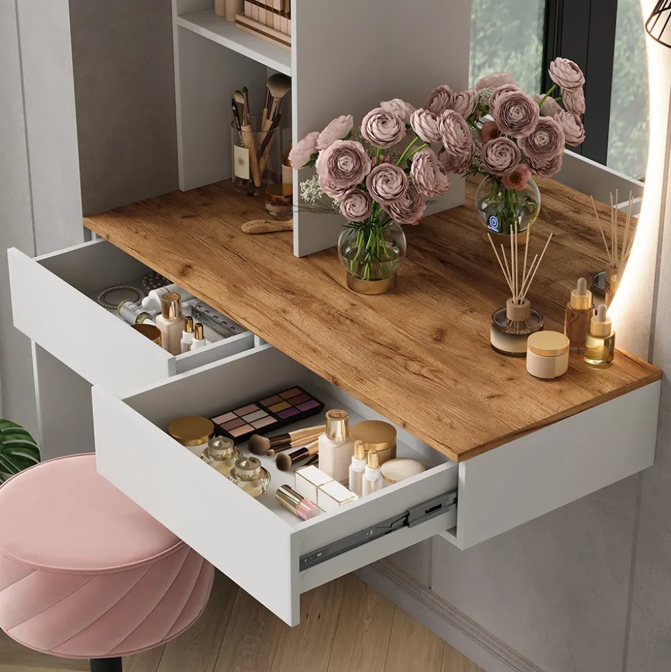 - MATERIAL: Die Schminkkommode besteht aus robustem 15 mm MDF mit einer Melaminharzbeschichtung, die pflegeleicht und langlebig ist.