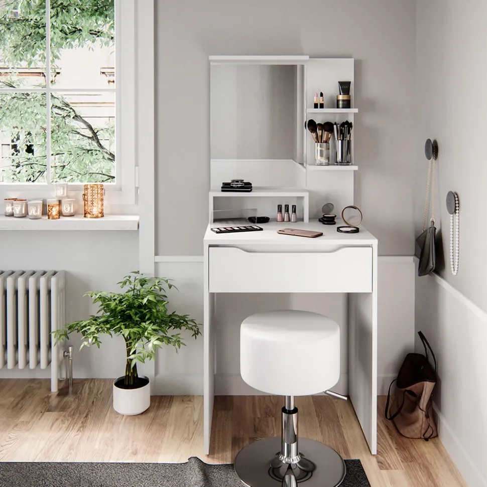 - MATERIAL: Die Schminkkommode besteht aus pflegeleichter Spanplatte 16 mm, mit einer Melaminharzbeschichtung