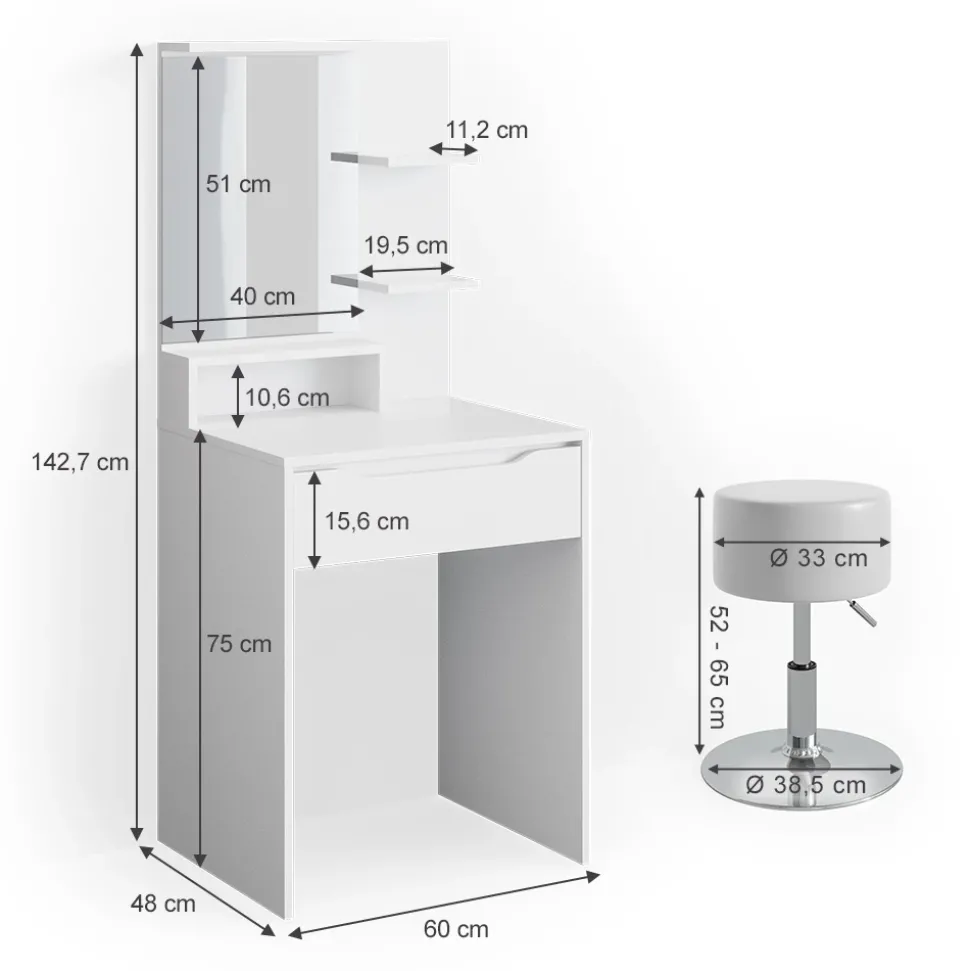 - MAßE: Der Frisiertisch hat eine Breite von 60 cm, eine Höhe von 142,7 cm und eine Tiefe von 48 cm. Alle detaillierten Größen sind auf den Fotos angegeben.