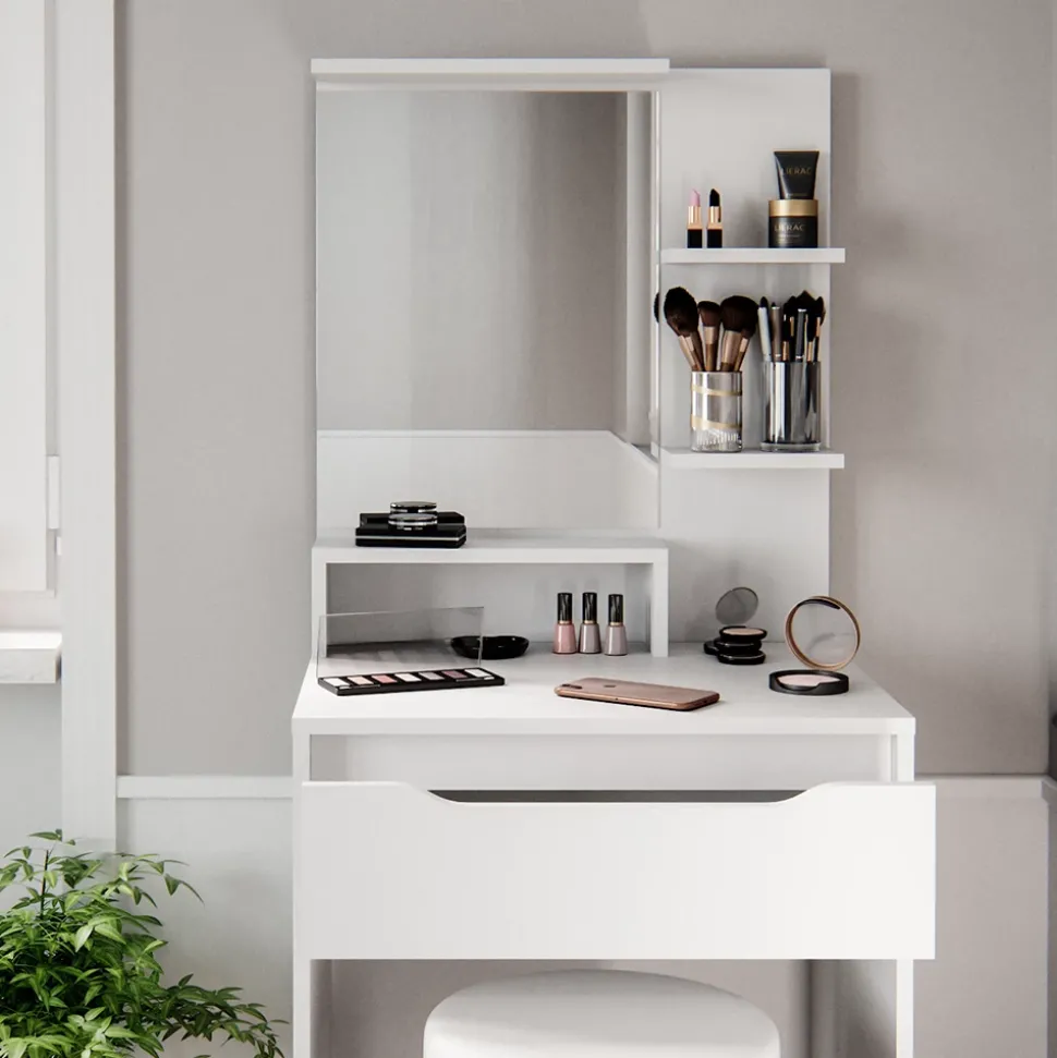 Der Schminktisch Ruben ist der perfekte Begleiter für Ihr tägliches Make-Up-Ritual. Mit seinem minimalistischen Design passt er in jeden Raum und bietet Ihnen gleichzeitig viel Stauraum für Ihre Kosmetikartikel. Die mehreren offenen Regale und geschlossenen Fächer helfen Ihnen dabei, Ihre Schätze ordentlich zu verstauen. Der elegante rechteckige Spiegel rundet das Design ab und lässt Sie immer perfekt aussehen. Das Besondere an diesem Modell ist, dass es in verschiedenen Ausführungen erhältlich ist, sodass Sie Ihren Schminktisch individualisieren können. Mit der dazu passenden Hocker, wird das Schminken und Stylen zu einem wahren Luxus. Entspannen Sie sich und gönnen Sie sich Ihren eigenen persönlichen Schönheitstisch.