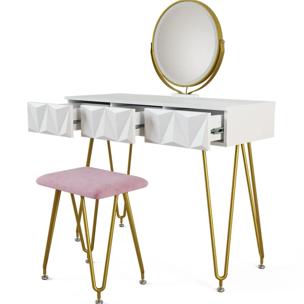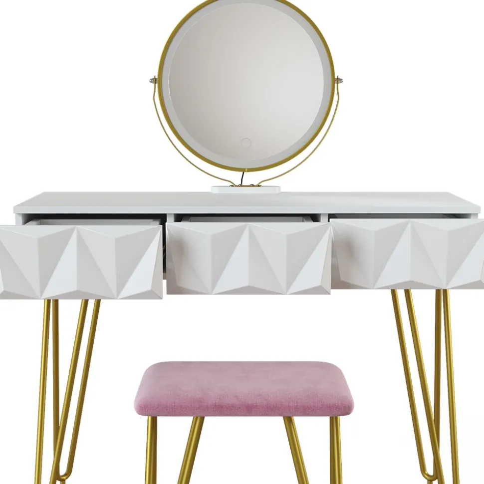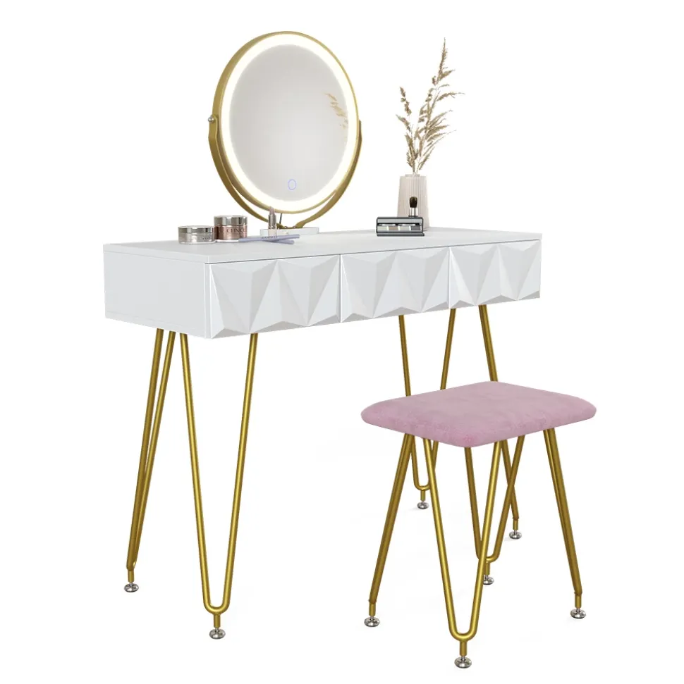 - Der Kosmetiktisch mit Spiegel bietet drei geschlossene Schubladen und elegante Metallbeine. Der runde Spiegel rundet das elegante Design ab.