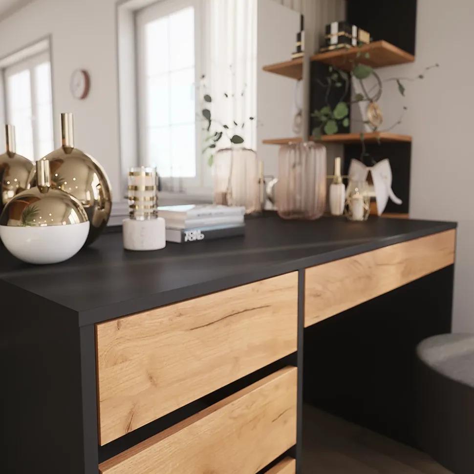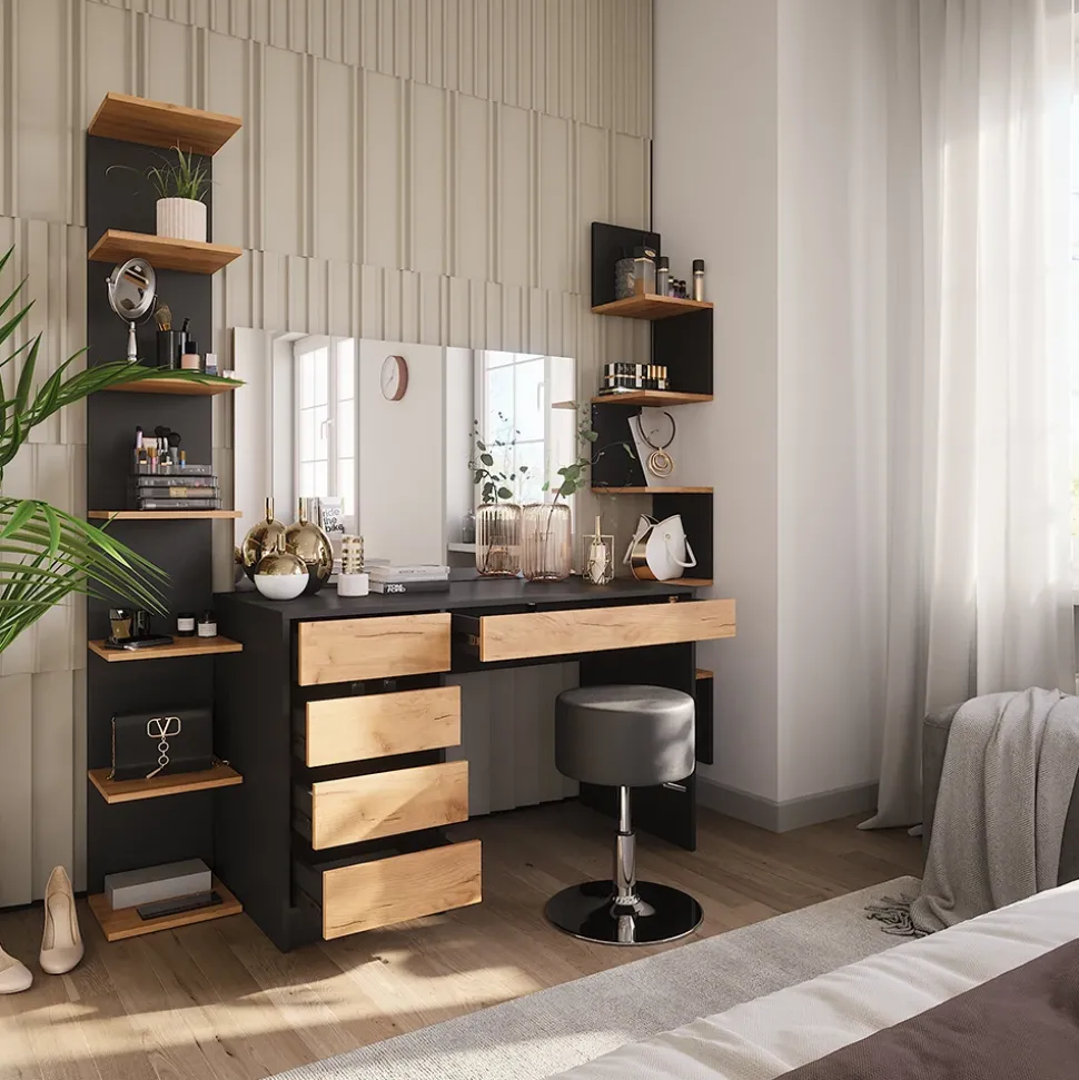 Die Möbelserie „Sherry“ umfasst Einrichtungsgegenstände für das Schlafzimmer, darunter auch Frisiertische. Mit vielen verschiedenen Optionen in verschiedenen Konfigurationen bietet sie vielseitige Gestaltungsmöglichkeiten. Verleihen Sie Ihrem Schlafzimmer mit den Möbeln der „Sherry“ Serie eine persönliche Note.