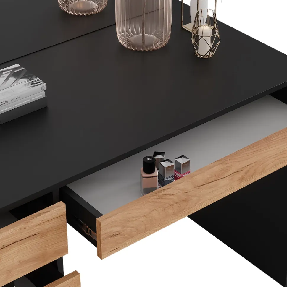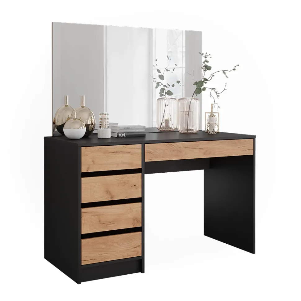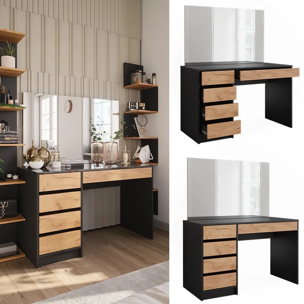 - Der Frisiertisch mit Spiegel verfügt über fünf geräumige Schubladen und eine stabile Konstruktion. Der große rechteckige Spiegel bietet ausreichend Platz für eine optimale Styling-Session.